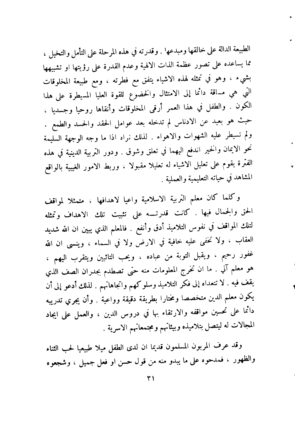 وكلما كان معلم التربية الإسلامية واعيا لأهدافها, متمثلا لمواقف الحق والجمال فيها. كانت قدرته على تثبيت تلك الأهداف وتمثله لتلك المواقف في نفوس التلاميذ أدق وأنفع. فالمعلم الذي يبين أن الله شديد العقاب، ولا تخفى عليه خافية في الأرض ولا في السماء، وينسى أن الله غفور رحيم، ويقبل التوبة من عباده، ويجب التائبين ويتقرب إليهم، هو معلم آلي. ما إن تخرج المعلومات منه حتى تصطدم بجدران الصف الذي يقف فيه، لا تتعداه إلى فكر التلاميذ وسلوكهم واتجاهاتهم. لذلك أدعو إلى أن يكون معلم الدين متخصصا ومختارا بطريقة دقيقة وواعية، وأن يجري تدريبه دائما على تحسين مواقفه والارتقاء بها في دروس الدين، والعمل على إيجاد المجالات له ليتصل بتلاميذه وبيئاتهم ومجتمعاتهم الأسرية.