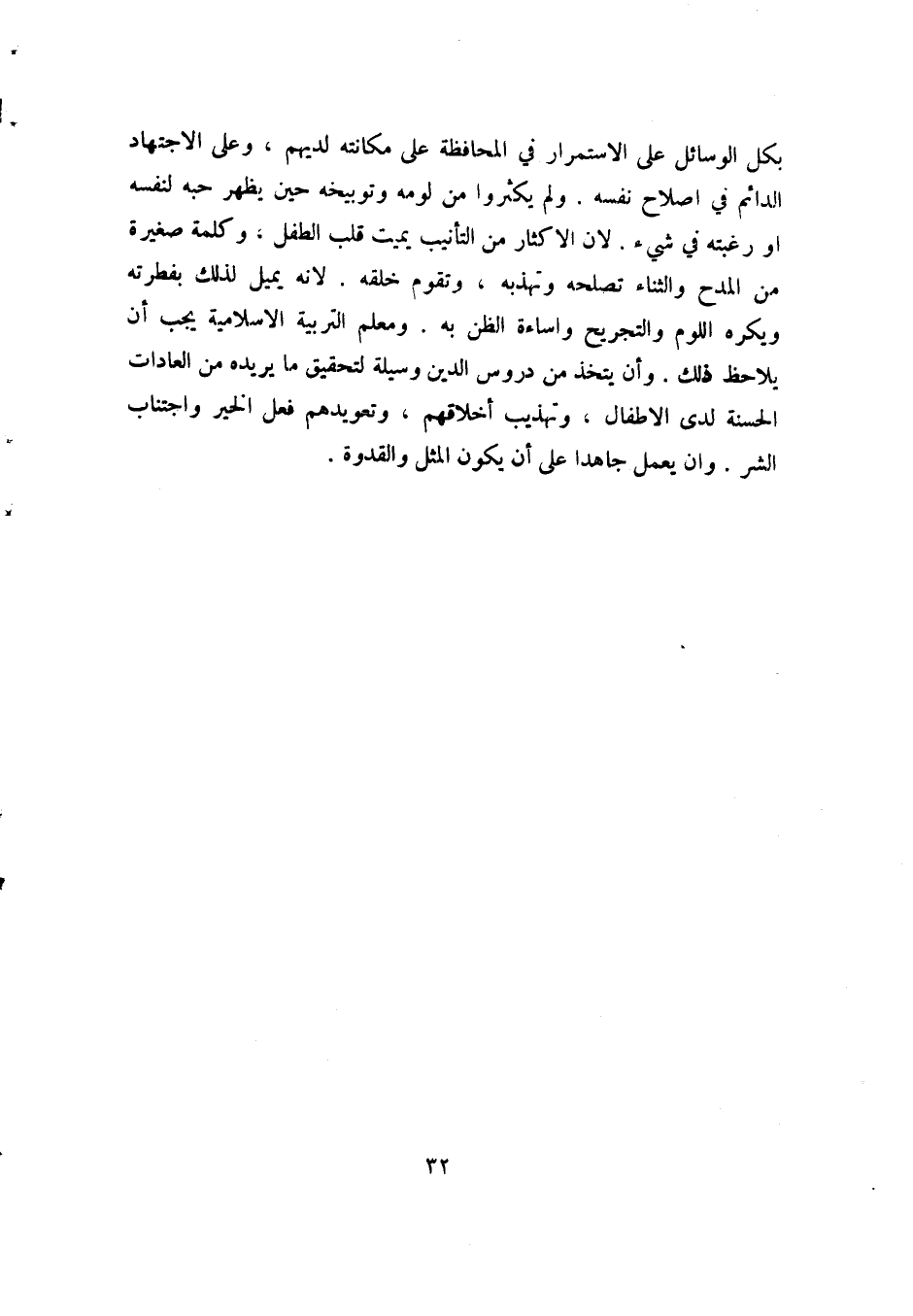 بكل الوسائل على الاستمرار في المحافظة على مكانته لديهم، وعلى الاجتهاد الدائم في إصلاح نفسه، ولم يكثروا من لومه وتوبيخه حين يظهر حبه لنفسه أو رغبته في شيء؛ لأن الإكثار من التأنيب يميت قلب الطفل، وكلمة صغيرة من المدح والثناء تصلحه وتهذبه، وتقوم خلقه؛ لأنه يميل لذلك بفطرته ويكوه اللوم والتجريح وإساءة الظن به. ومعلم التربية الإسلامية يجب أن يلاحظ ذلك. وأن يتخذ من دروس الدين وسيلة لتحقيق ما يريده من العادات الحسنة لدى الأطفال، وتهذيب أخلاقهم، وتعويدهم فعل الخير واجتناب الشر. وأن يعمل جاهدا على أن يكون المثل والقدوة.
