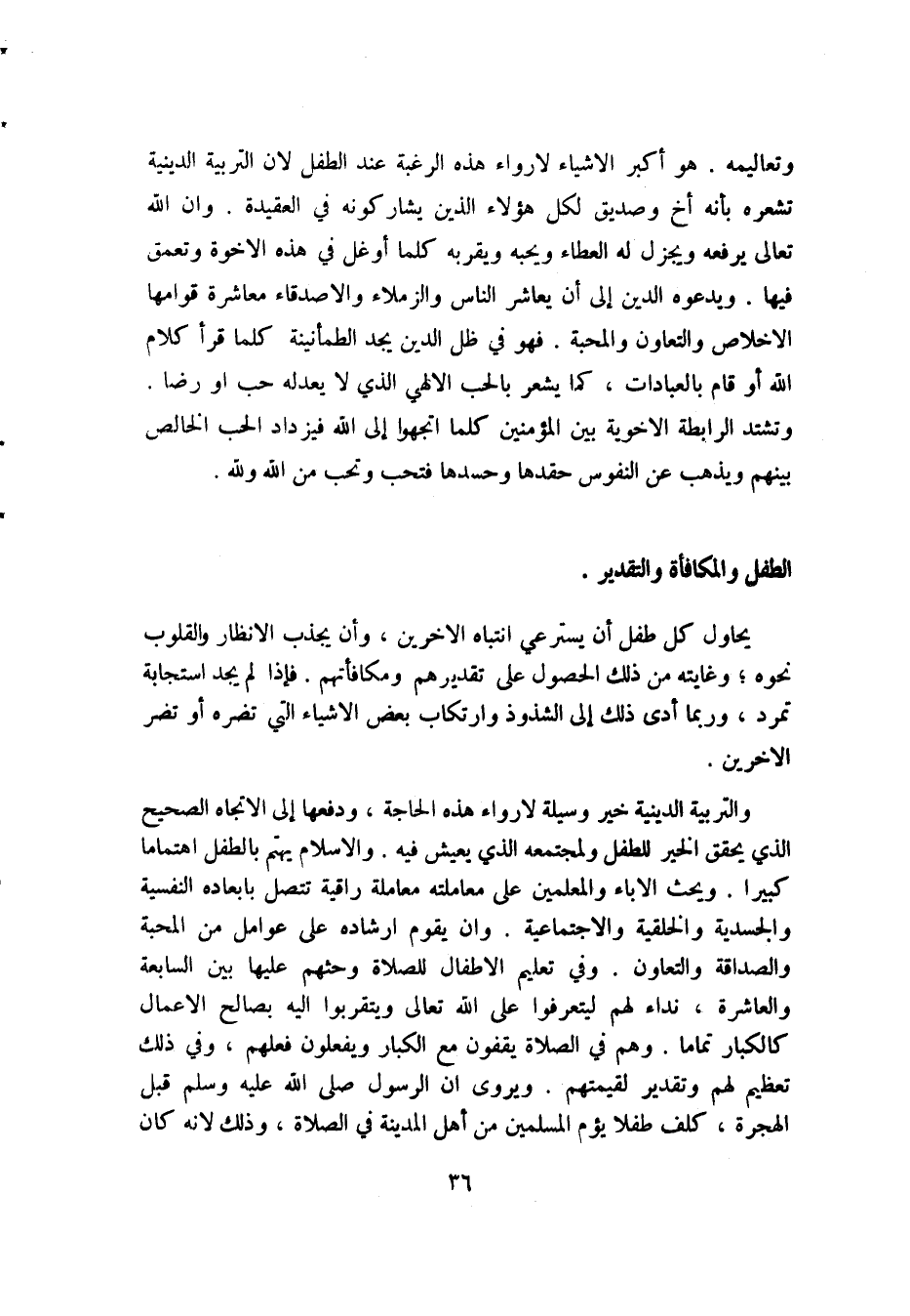 والتربية الدينية خير وسيلة لإرواء هذه الحاجة. ودفعها إلى الاتجاه الصحيح الذي يحقق الخير للطفل ولمجتمعه الذي يعيش فيه. والإسلام يهتم بالطفل اهتماما كبيرا. ويحث الأباء والمعلمين على معاملته معاملة راقية تتصل بأبعاده النفسية والجسدية والخلقية والاجتماعية. وأن يقوم إرشاده على عوامل من المحبة والصداقة والتعاون. وفي تعليم الأطفال للصلاة وحثهم عليها بين السابعة والعاشرة، نداء لهم ليتعرفوا على الله تعالى ويتقربوا إليه بصالح الأعمال كالكبار تماما. وهم في الصلاة يقفون مع الكبار ويفعلون فعلهم، وفي ذلك تعظيم لهم وتقدير لقيمتهم. ويروى أن الرسول -صلى الله عليه وسلم- قبل الهجرة، كلف طفلا يؤم المسلمين من أهل المدينة في الصلاة؛ وذلك لأنه كان