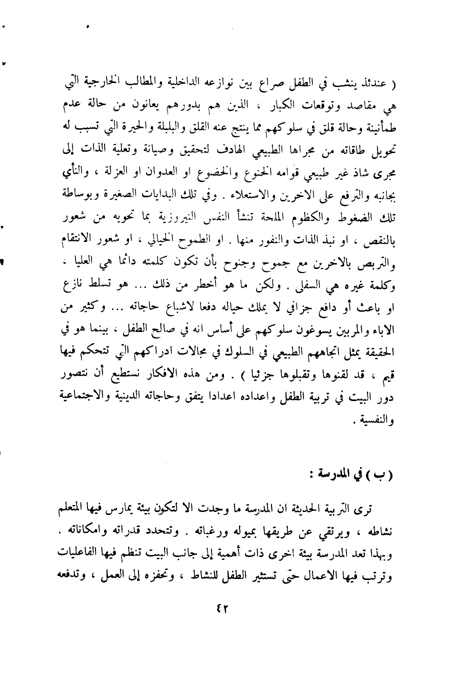 "عندئذ ينشب في الطفل صراع بين نوازعه الداخلية والمطالب الخارجية التي هي مقاصد وتوقعات الكبار، الذين هم بدورهم يعانون من حالة عدم طمأنينة وحالة قلق في سلوكهم مما ينتج عنه القلق والبلبلة والحيرة التي تسبب له تحويل طاقاته من مجراها الطبيعي الهادف لتحقيق وصيانة وتعلية الذات إلى مجرى شاذ غير طبيعي, قوامه الخنوع والخضوع أو العدوان أو العزلة، والنأي بجانبه والترفع على الآخرين والاستعلاء. وفي تلك البدايات الصغيرة وبوساطة تلك الضغوط والكظوم الملحة تنشأ النفس النيروزية بما تحويه من شعور بالنقص، أو نبذ الذات والنفور منها. أو الطموح الخيالي، أو شعور الانتقام والتربص بالآخرين مع جموح وجنوح بأن تكون كلمته دائما هي العليا، وكلمة غيره هي السفلى، ولكن ما هو أخطر من ذلك ... هو تسلط نازع أو باعث أو دافع جزافي لا يملك حياله دفعا لإشباع حاجاته.. وكثير من الأباء والمربين يسوغون سلوكهم على أساس أنه في صالح الطفل، بينما هو في الحقيقة يمثل اتجاههم الطبيعي في السلوك في مجالات إدراكهم التي تتحكم فيها قيم، قد لقنوها وتقبلوها جزئيا". ومن هذه الأفكار نستطيع أن نتصور دور البيت في تربية الطفل وإعداده إعدادا يتفق وحاجاته الدينية والاجتماعية والنفسية.