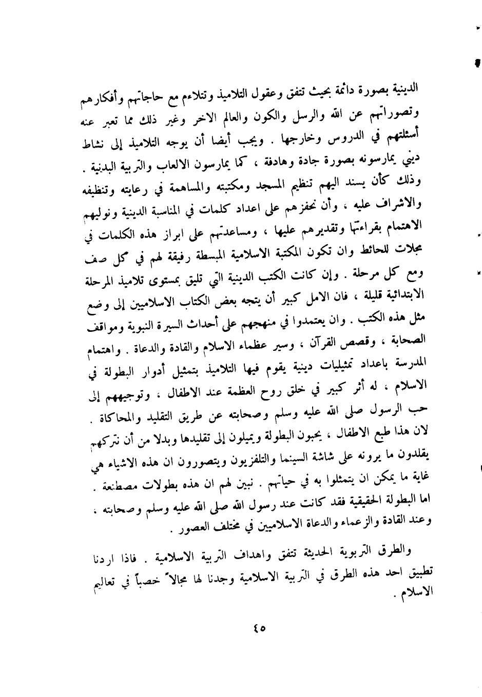 الدينية بصورة دائمة بحيث تتفق وعقول التلاميذ وتتلاءم مع حاجاتهم وأفكارهم وتصوراتهم عن الله والرسل والكون والعالم الآخر, وغير ذلك مما تعبر عنه أسئلتهم في الدروس وخارجها. ويجب أيضا أن يوجه التلاميذ إلى نشاط ديني يمارسونه بصورة جادة وهادفة، كما يمارسون الألعاب والتربية البدنية. وذلك كأن يسند إليهم تنظيم المسجد ومكتبته والمساهمة في رعايته وتنظيفه والإشراف عليه، وأن نحفزهم على إعداد كلمات في المناسبة الدينية ونوليهم الاهتمام بقراءتها وتقديرهم عليها، ومساعدتهم على إبراز هذه الكلمات في مجلات للحائط, وأن تكون المكتبة الإسلامية المبسطة رفيقة لهم في كل صف ومع كل مرحلة. وإن كانت الكتب الدينية التي تليق بمستوى تلاميذ المرحلة الابتدائية قليلة، فإن الأمل كبير أن يتجه بعض الكتاب الإسلاميين إلى وضع مثل هذه الكتب. وأن يعتمدوا في منهجهم على أحداث السيرة النبوية ومواقف الصحابة، وقصص القرآن، وسير عظماء الإسلام والقادة والدعاة. واهتمام المدرسة بإعداد تمثيليات دينية يقوم فيها التلاميذ بتمثيل أدوار البطولة في الإسلام، له أثر كبير في خلق روح العظمة عند الأطفال، وتوجيههم إلى حب الرسول -صلى الله عليه وسلم- وصحابته عن طريق التقليد والمحاكاة. لأن هذا طبع الأطفال، يحبون البطولة ويميلون إلى تقليدها, وبدلا من أن نتركهم يقلدون ما يرونه على شاشة السينما والتلفزيون ويتصورون أن هذه الأشياء هي غاية ما يمكن أن يتمثلوا به في حياتهم. نبين لهم أن هذه بطولات مصطنعة. أما البطولة الحقيقية فقد كانت عند رسول الله -صلى الله عليه وسلم- وصحابته، وعند القادة والزعماء والدعاة الإسلاميين في مختلف العصور.