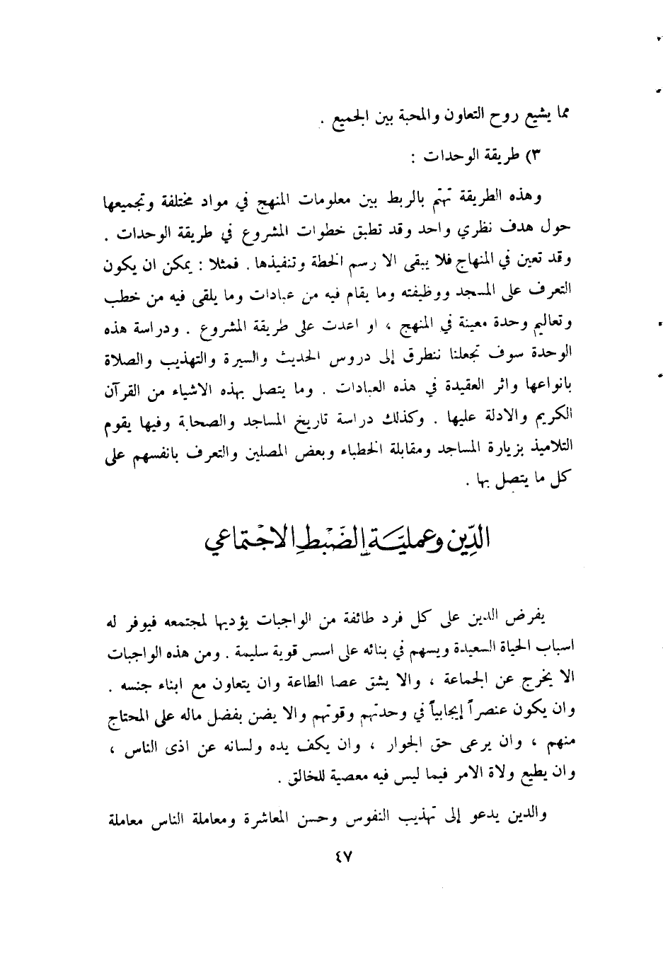 يفرض الدين على كل فرد طائفة من الواجبات يؤديها لمجتمعه فيوفر له أسباب الحياة السعيدة ويسهم في بنائه على أسس قوية سليمة. ومن هذه الواجبات ألا يخرج عن الجماعة، وألا يشق عصا الطاعة وأن يتعاون مع أبناء جنسه. وأن يكون عنصرا إيجابيا في وحدتهم وقوتهم وألا يضن بفضل ماله على المحتاج منهم، وأن يرعى حق الجوار، وأن يكف يده ولسانه عن أذى الناس، وأن يطيع ولاة الأمر فيما ليس فيه معصية للخالق.