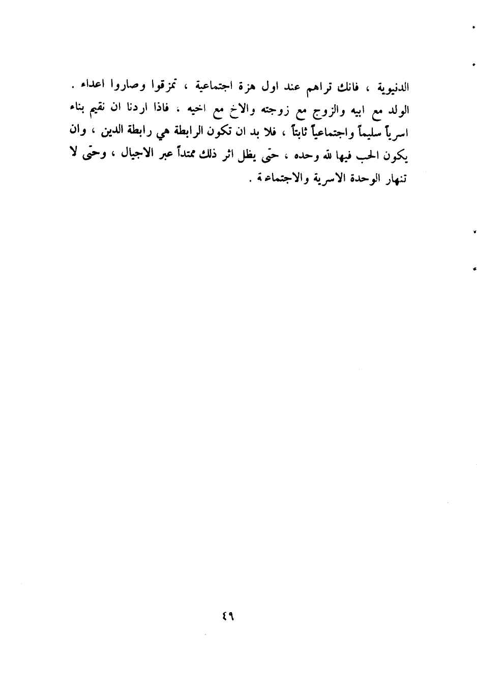 الدنيوية، فإنك تراهم عند أول هزة اجتماعية، تمزقوا وصاروا أعداء. الولد مع أبيه والزوج مع زوجته والأخ مع أخيه، فإذا أردنا أن نقيم بناء أسريا سليما واجتماعيا ثابتا، فلا بد أن تكون الرابطة هي رابطة الدين، وأن يكون الحب فيها لله وحده، حتى يظل أثر ذلك ممتدا عبر الأجيال، وحتى لا تنهار الوحدة الأسرية والاجتماعية.