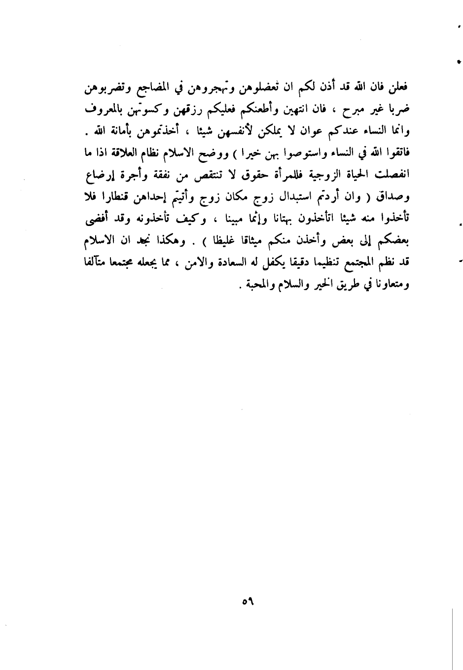 فعلن فإن الله قد أذن لكم أن تعضلوهن وتهجروهن في المضاجع وتضربوهن ضربا غير مبرح، فإن انتهين وأطعنكم فعليكم رزقهن وكسوتهن بالمعروف, وإنما النساء عندكم عوان لا يملكن لأنفسهن شيئا، أخذتموهن بأمانة الله. فاتقوا الله في النساء واستوصوا بهن خيرا" ووضح الإسلام نظام العلاقة إذا ما انفصلت الحياة الزوجية فللمرأة حقوق لا تنتقص من نفقة وأجرة إرضاع وصداق {وَإِنْ أَرَدْتُمُ اسْتِبْدَالَ زَوْجٍ مَكَانَ زَوْجٍ وَآَتَيْتُمْ إِحْدَاهُنَّ قِنْطَارًا فَلا تَأْخُذُوا مِنْهُ شَيْئًا أَتَأْخُذُونَهُ بُهْتَانًا وَإِثْمًا مُبِينًا، وَكَيْفَ تَأْخُذُونَهُ وَقَدْ أَفْضَى بَعْضُكُمْ إِلَى بَعْضٍ وَأَخَذْنَ مِنْكُمْ مِيثَاقًا غَلِيظًا} ، وهكذا نجد أن الإسلام قد نظم المجتمع تنظيما دقيقا يكفل له السعادة والأمن، مما يجعله مجتمعا متآلفا ومتعاونا في طريق الخير والسلام والمحبة.