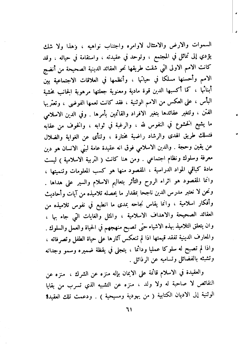 السموات والأرض والامتثال لأوامره واجتناب نواهيه، وهذا ولا شك يؤدي إلى تماثل في المجتمع، وتوحد في عقيدته, واستقامة في حياته، وقد كانت الأمم الأولى التي شقت طريقها نحو العقائد الدينية الصحيحة من أنضج الأمم وأحسنها مسلكا في حياتها، وأنظمها في العلاقات الاجتماعية بين أبنائها، كما أكسبها الدين قوة مادية ومعنوية جعلتها مرهوبة الجانب مخشية البأس، على العكس من الأمم الوثنية، فقد كانت تعمها الفوضى، وتعتريها الفتن، وتتغير عقائدها بتغير الأفراد والقائمين بأمرها. وفي الدين الإسلامي ما يشيع الخشوع في النفوس لله، والرغبة في ثوابه، والخوف من عقابه فتسلك طريق الهدى والرشاد راضية مختارة، وتنأى عن الغواية والضلال عن يقين وحجة. والدين الإسلامي فوق إنه عقيدة عامة لبني الإنسان هو دين معرفة وسلوك ونظام اجتماعي. ومن هنا كانت "التربية الإسلامية" ليست مادة كباقي المواد الدراسية، المقصود منها هو كسب المعلومات وتنميتها، وإنما المقصود هو إثراء الروح والتأثر بتعاليم الإسلام والسير على هداها. ونحن لا نعتبر مدرس الدين ناجحا بمقدار ما يحصله تلاميذه من آيات وأحاديث وأفكار إسلامية، وإنما يقاس نجاحه بمدى ما انطبع في نفوس تلاميذه من العقائد الصحيحة والأهداف الإسلامية، والمثل والغايات التي جاء بها، وأن يتعلق التلاميذ بهذه الأشياء حتى تصبح منهجهم في الحياة والعمل والسلوك. والمعارف الدينية تفقد قيمتها إذا لم تنعكس آثارها على حياة الطفل وتصرفاته، وإذا لم تصبح له سلوكا عمليا ودائما، يتجلى في يقظة ضميره وسمو وجدانه وتشبثه بالفضائل وتساميه عن الرذائل.