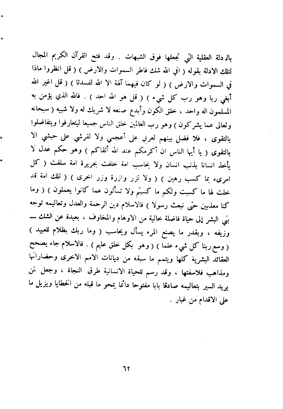 بالأدلة العقلية التي تجعلها فوق الشبهات. وقد فتح القرآن الكريم المجال لتلك الأدلة بقوله: {أَفِي اللَّهِ شَكٌّ فَاطِرِ السَّمَاوَاتِ وَالْأَرْض} {قُلِ انْظُرُوا مَاذَا فِي السَّمَاوَاتِ وَالْأَرْضِ} {لَوْ كَانَ فِيهِمَا آلِهَةٌ إِلَّا اللَّهُ لَفَسَدَتَا} {قُلْ أَغَيْرَ اللَّهِ أَبْغِي رَبًّا وَهُوَ رَبُّ كُلِّ شَيْءٍ} {قُلْ هُوَ اللَّهُ أَحَدٌ} . فالله الذي يؤمن به المسلمون إله واحد، خلق الكون وأبدع صنعه لا شريك له ولا شبيه {سُبْحَانَهُ وَتَعَالَى عَمَّا يُشْرِكُونَ} وهو رب العالمين خلق الناس جميعا ليتعارفوا ويتفاضلوا بالتقوى، فلا فضل بينهم لعربي على أعجمي ولا لقرشي على حبشي إلا بالتقوى {إِنَّ أَكْرَمَكُمْ عِنْدَ اللَّهِ أَتْقَاكُمْ} وهو حكم عدل لا يأخذا إنسانا بذنب إنسان ولا يحاسب أمة خلقت بجريرة أمة سلفت {كُلُّ امْرِئٍ بِمَا كَسَبَ رَهِينٌ} {وَلا تَزِرُ وَازِرَةٌ وِزْرَ أُخْرَى} {تِلْكَ أُمَّةٌ قَدْ خَلَتْ لَهَا مَا كَسَبَتْ وَلَكُمْ مَا كَسَبْتُمْ وَلَا تُسْأَلُونَ عَمَّا كَانُوا يَعْمَلُونَ} {وَمَا كُنَّا مُعَذِّبِينَ حَتَّى نَبْعَثَ رَسُولًا} فالإسلام دين الرحمة والعدل وتعاليمه توجه بني البشر إلى حياة فاضلة خالية من الأوهام والمخاوف، بعيدة عن الشك وزيفه، وبقدر ما يصنع المرء يسأل ويحاسب {وَمَا رَبُّكَ بِظَلَّامٍ لِلْعَبِيدِ} {وَسِعَ رَبُّنَا كُلَّ شَيْءٍ عِلْمًا} {وَهُوَ بِكُلِّ خَلْقٍ عَلِيم} فالإسلام جاء يصحح العقائد البشرية كلها ويتمم ما سبقه من ديانات الأمم الأخرى وحضاراتها ومذاهب فلاسفتها، وقد رسم للحياة الإنسانية طرق النجاة، وجعل لمن يريد السير بتعاليمه صادقا بابا مفتوحا دائما يمحو ما قبله من الخطايا ويزيل ما على الأقدام من غبار.