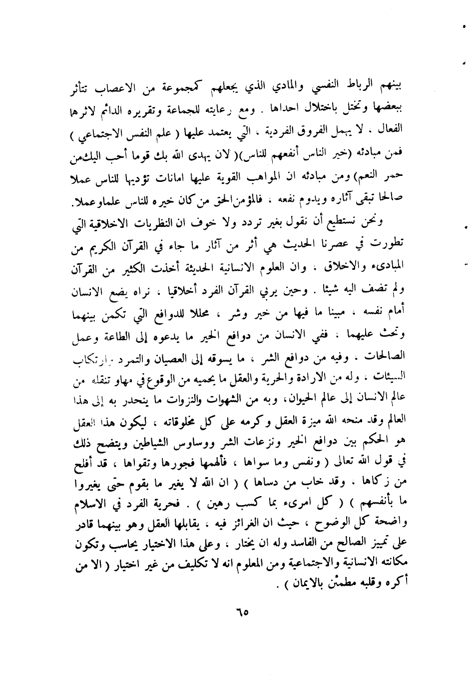 بينهم الرباط النفسي والمادي الذي يجعلهم كمجموعة من الأعصاب تتأثر ببعضها وتختل باختلال إحداها. ومع رعايته للجماعة وتقريره الدائم لأثرهما الفعال لا يهمل الفروق الفردية، التي يعتمد عليها "علم النفس الاجتماعي" فمن مبادئه "خير الناس أنفعهم للناس" "لأن يهدي الله بك قوما أحب إليك من حمر النعم" ومن مبادئه أن المواهب القوية عليها أمانات تؤديها للناس عملا صالحا تبقي آثاره ويدوم نفعه، فالمؤمن الحق من كان خيره للناس علما وعملا. ونحن نستطيع أن نقول بغير تردد ولا خوف أن النظريات الأخلاقية التي تطورت في عصرنا الحديث هي أثر من آثار ما جاء في القرآن الكريم من المبادئ والأخلاق، وأن العلوم الإنسانية الحديثة أخذت الكثير من القرآن ولم تضف إليه شيئا. وحين يربي القرآن الفرد أخلاقيا، نراه يضع الإنسان أمام نفسه، مبينا ما فيها من خير وشر، محللا للدوافع التي تكمن بينهما وتحث عليهما، ففي الإنسان من دوافع الخير ما يدعوه إلى الطاعة وعمل الصالحات، وفيه من دوافع الشر، ما يسوقه إلى العصيان والتمرد وارتكاب السيئات وله من الإرادة والحرية والعقل ما يحميه من الوقوع في مهاو تنقله من عالم الإنسان إلى عالم الحيوان, وبه من الشهوات والنزوات ما ينحدر به إلى هذا العالم, وقد منحه الله ميزة العقل وكرمه على كل مخلوقاته، ليكون هذا العقل هو الحكم بين الخير ونزعات الشر ووساوس الشياطين ويتضح ذلك في قول الله تعالى: {وَنَفْسٍ وَمَا سَوَّاهَا، فَأَلْهَمَهَا فُجُورَهَا وَتَقْوَاهَا، قَدْ أَفْلَحَ مَنْ زَكَّاهَا، وَقَدْ خَابَ مَنْ دَسَّاهَا} {إِنَّ اللَّهَ لَا يُغَيِّرُ مَا بِقَوْمٍ حَتَّى يُغَيِّرُوا مَا بِأَنْفُسِهِمْ} {كُلُّ امْرِئٍ بِمَا كَسَبَ رَهِينٌ} . فحرية الفرد في الإسلام واضحة كل الوضوح، حيث إن الغرائز فيه، يقابلها العقل وهو بينهما قادر على تمييز الصالح من الفاسد وله أن يختار. وعلى هذا الاختيار يحاسب وتكون مكانته الإنسانية والاجتماعية, ومن المعلوم أنه لا تكليف من غير اختيار {إِلَّا مَنْ أُكْرِهَ وَقَلْبُهُ مُطْمَئِنٌّ بِالْإِيمَانِ} .