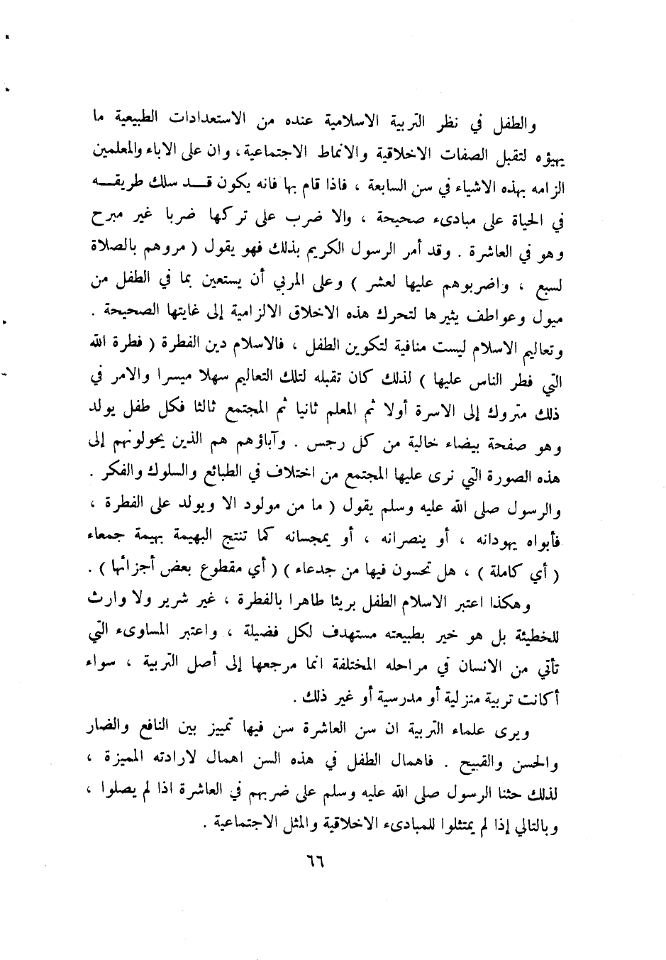 والطفل في نظر التربية الإسلامية عنده من الاستعدادات الطبيعية ما يهيؤه لتقبل الصفات الأخلاقية والأنماط الاجتماعية، وإن على الأباء والمعلمين إلزامه بهذه الأشياء في سن السابعة، فإذا قام بها فإنه يكون قد سلك طريقه في الحياة على مبادئ صحيحه، وإلا ضرب على تركها ضربا غير مبرح وهو في العاشرة. وقد أمر الرسول الكريم بذلك فهو يقول "مروهم بالصلاة لسبع, واضربوهم عليها لعشر" وعلى المربي أن يستعين بما في الطفل من ميول وعواطف يثيرها لتحرك هذه الأخلاق الإلزامية إلى غايتها الصحيحة, وتعاليم الإسلام ليست منافيه لتكوين الطفل، فالإسلام دين الفطرة {فِطْرَةَ اللَّهِ الَّتِي فَطَرَ النَّاسَ عَلَيْهَا} لذلك كان تقبله لتلك التعاليم سهلا ميسرا, والأمر في ذلك متروك إلى الأسرة أولا ثم المعلم ثانيا ثم المجتمع ثالثا فكل طفل يولد وهو صفحة بيضاء خالية من كل رجس. وآباؤهم هم الذين يحولونوهم إلى هذه الصورة التي نرى عليها المجتمع من اختلاف في الطبائع والسلوك والفكر. والرسول -صلى الله عليه وسلم- يقول: "ما من مولود إلا ويولد على الفطرة، فأبواه يهودانه، أو ينصرانه، أو يمجسانه كما تنتج البهيمة بهيمة جمعاء -أي: كاملة- هل تحسون فيها من جدعاء" أي: مقطوع بعض أجزائها.