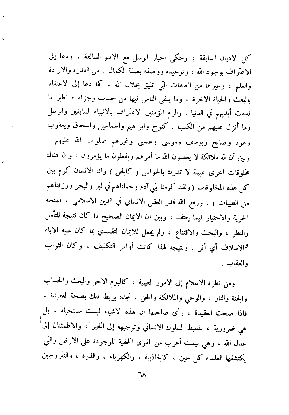 وبين أن لله ملائكة لا يعصون الله ما أمرهم ويفعلون ما يؤمرون، وأن هناك مخلوقات أخرى غيبية لا تدرك بالحواس "كالجن" وأن الإنسان كرم بين كل هذه المخلوقات {وَلَقَدْ كَرَّمْنَا بَنِي آدَمَ وَحَمَلْنَاهُمْ فِي الْبَرِّ وَالْبَحْرِ وَرَزَقْنَاهُمْ مِنَ الطَّيِّبَاتِ} , ورفع الله قدر العقل الإنساني في الدين الإسلامي، فمنحه الحرية والاختيار فيما يعتقد، وبين أن الإيمان الصحيح ما كانت نتيجة للتأمل والنظر، والبحث والإقناع، ولم يجعل للإيمان التقليدي بما كان عليه الأباء والأسلاف أي أثر. ونتيجة لهذا كانت أوامر التكليف، وكان الثواب والعقاب.