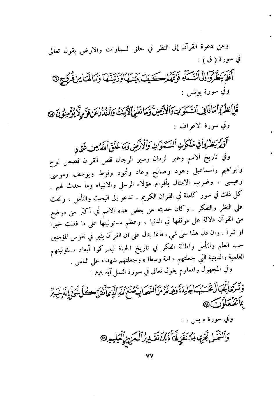 كل ذلك في سور كاملة في القرآن الكريم. تدعو إلى البحث والتأمل، وتحث على النظر والتفكر. وكان حديثه عن بعض هذه الأمم في أكثر من موضع. من القرآن دلالة على موقفها في الدنيا، وعظم مسئوليتها على ما فعلت خيرا أو شرا. وإن دل هذا على شيء فإنما يدل على أن القرآن يثير في نفوس المؤمنين حب العلم والتأمل وإطالة الفكر في تاريخ الحياة ليدركوا أبعاد مسئوليتهم العلمية والدينية والتي جعلتهم "أمة وسطا" وجعلتهم شهداء على الناس.