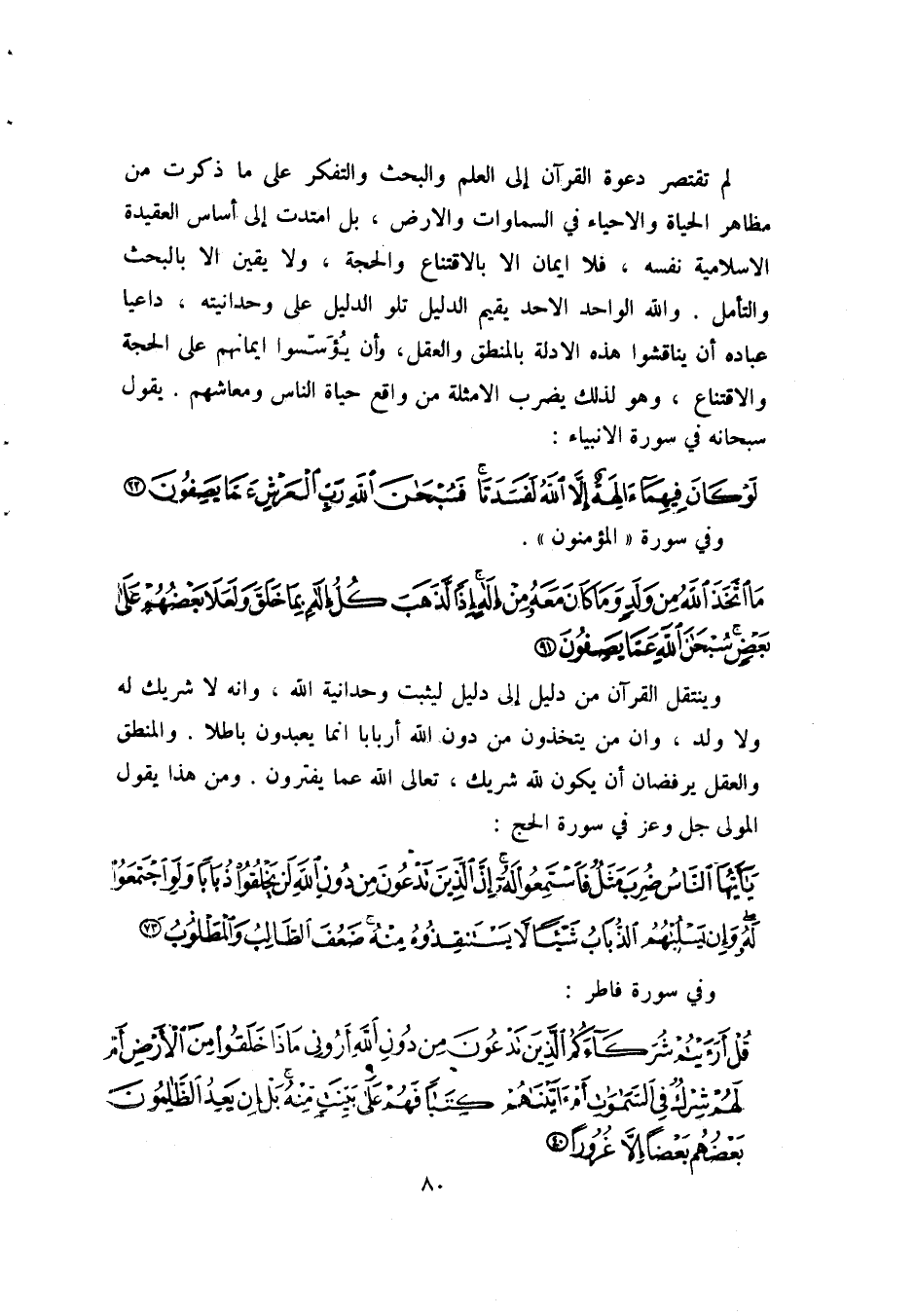 لم تقتصر دعوة القرآن إلى العلم والبحث والتفكر على ما ذكرت من مظاهر الحياة والأحياء في السموات والأرض، بل امتدت إلى أساس العقيدة الإسلامية نفسه، فلا إيمان إلا بالاقتناع والحجة، ولا يقين إلا بالبحث والتأمل. والله الواحد الأحد يقيم الدليل تلو الدليل على وحدانيته، داعيا عباده أن يناقشوا هذه الأدلة بالمنطق والعقل، وأن يؤسسوا إيمانهم على الحجة والاقتناع، وهو لذلك يضرب الأمثلة من واقع حياة الناس ومعاشهم. يقول سبحانه في سورة الأنبياء: