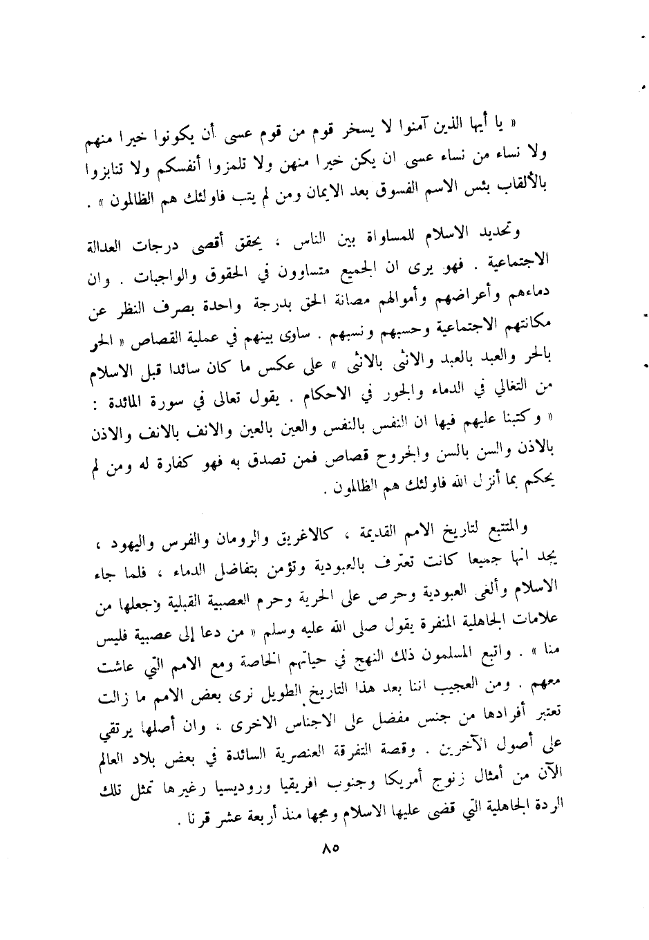 والمتتبع لتاريخ الأمم القديمة، كالإغريق والرومان والفرس واليهود، يجد أنها جميعا كانت تعترف بالعبودية وتؤمن بتفاضل الدماء، فلما جاء الإسلام وألغى العبودية وحرص على الحرية وحرم العصبية القبلية وجعلها من علامات الجاهلية المنفرة يقول -صلى الله عليه وسلم: "من دعا إلى عصبية فليس منا". واتبع المسلمون ذلك النهج في حياتهم الخاصة ومع الأمم التي عاشت معهم. ومن العجيب أننا بعد هذا التاريخ الطويل نرى بعض الإمم ما زالت تعتبر أفرادها من جنس مفضل على الأجناس الأخرى. وأن أصلها يرتقي على أصول الآخرين. وقصة التفرقة العنصرية السائدة في بعض بلاد العالم الآن من أمثال زنوج أمريكا وجنوب إفريقيا وروديسيا وغيرها تمثل تلك الردة الجاهلية التي قضى عليها الإسلام ومجها منذ أربعة عشر قرنا.