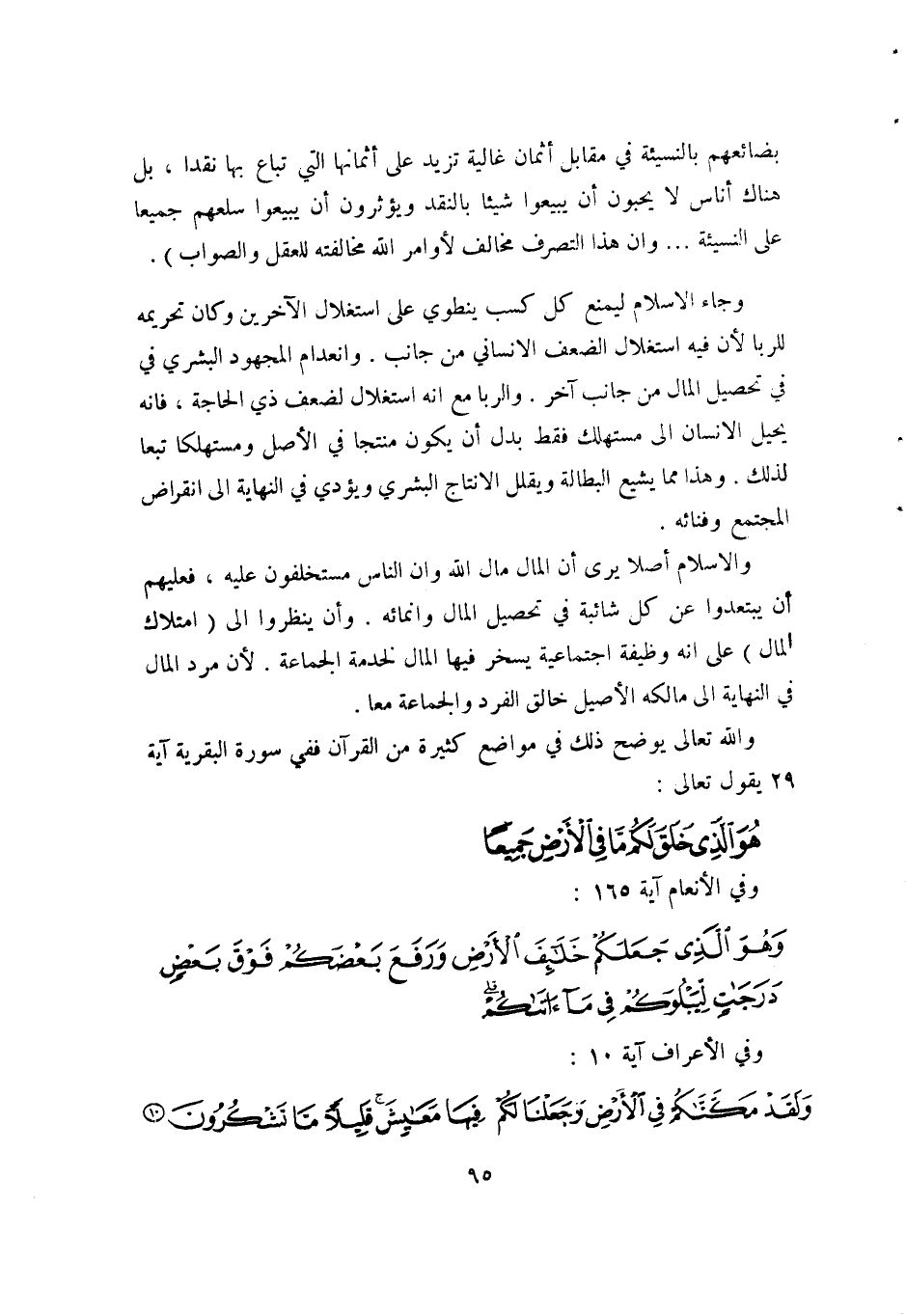 بضائعهم بالنسيئة في مقابل أثمان غالية تزيد على أثمانها التي تباع بها نقدا، بل هناك أناس لا يحبون أن يبيعوا شيئا بالنقد ويؤثرون أن يبيعوا سلعهم جميعا على النسيئة ... وإن هذا التصرف مخالف لأوامر الله مخالفته للعقل والصواب".
