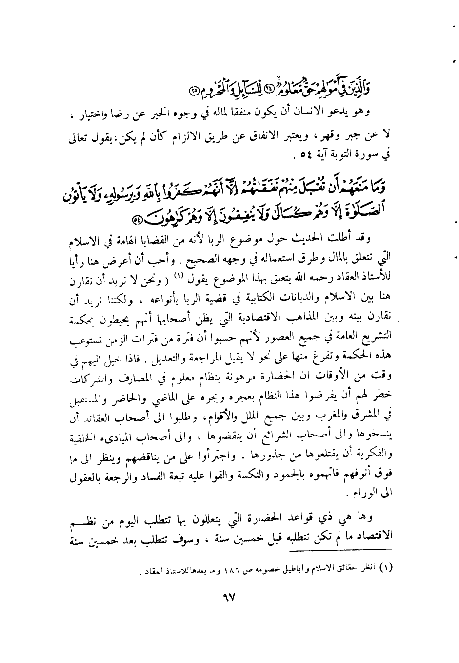 وقد أطلت الحديث حول موضوع الربا؛ لأنه من القضايا الهامة في الإسلام التي تتعلق بالمال وطرق استعماله في وجهه الصحيح، وأحب أن أعرض هنا رأيا للأستاذ العقاد رحمه الله يتعلق بهذا الموضوع يقول1: "ونحن لا نريد أن نقارن هنا بين الإسلام والديانات الكتابية في قضية الربا بأنواعه، ولكننا نريد أن نقارن بينه وبين المذاهب الاقتصادية التي يظن أصحابها أنهم يحيطون بحكمة التشريع العامة في جميع العصور؛ لأنهم حسبوا أن فترة من فترات الزمن تستوعب هذه الحكمة وتفرغ منها على نحو لا يقبل المراجعة والتعديل. فإذا خيل إليهم في وقت من الأوقات أن الحضارة مرهونة بنظام معلوم في المصارف والشركات خطر لهم أن يفرضوا هذا النظام بعجره وبجره على الماضي والحاضر والمستقبل في المشرق والمغرب وبين جميع الملل والأقوام، وطلبوا إلى أصحاب العقائد أن ينسخوها وإلى أصحاب الشرائع أن ينقضوها، وإلى أصحاب المبادئ الخلقية والفكرية أن يقتلعوها من جذورها، واجترءوا على من يناقضهم وينظر إلى مما فوق أنوفهم فاتهموه بالجمود والنكسة, وألقوا عليه تبعة الفساد والرجعة بالعقول إلى الوراء.
