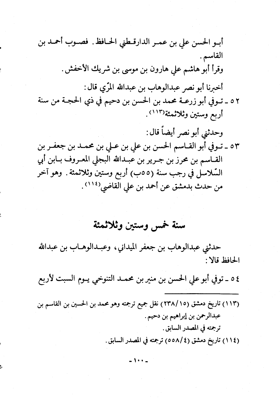 53 - توفّي أَبُو الْقَاسِم الْحسن بن عَليّ بن عَليّ بن مُحَمَّد بن جَعْفَر بن الْقَاسِم بن مُحرز بن جرير بن عبد الله البَجلِيّ الْمَعْرُوف بِابْن أبي السلَاسِل فِي رَجَب سنة (55 ب) أَربع وَسِتِّينَ وثلاثمئة وَهُوَ آخر من حدث بِدِمَشْق عَن أَحْمد بن عَليّ القَاضِي