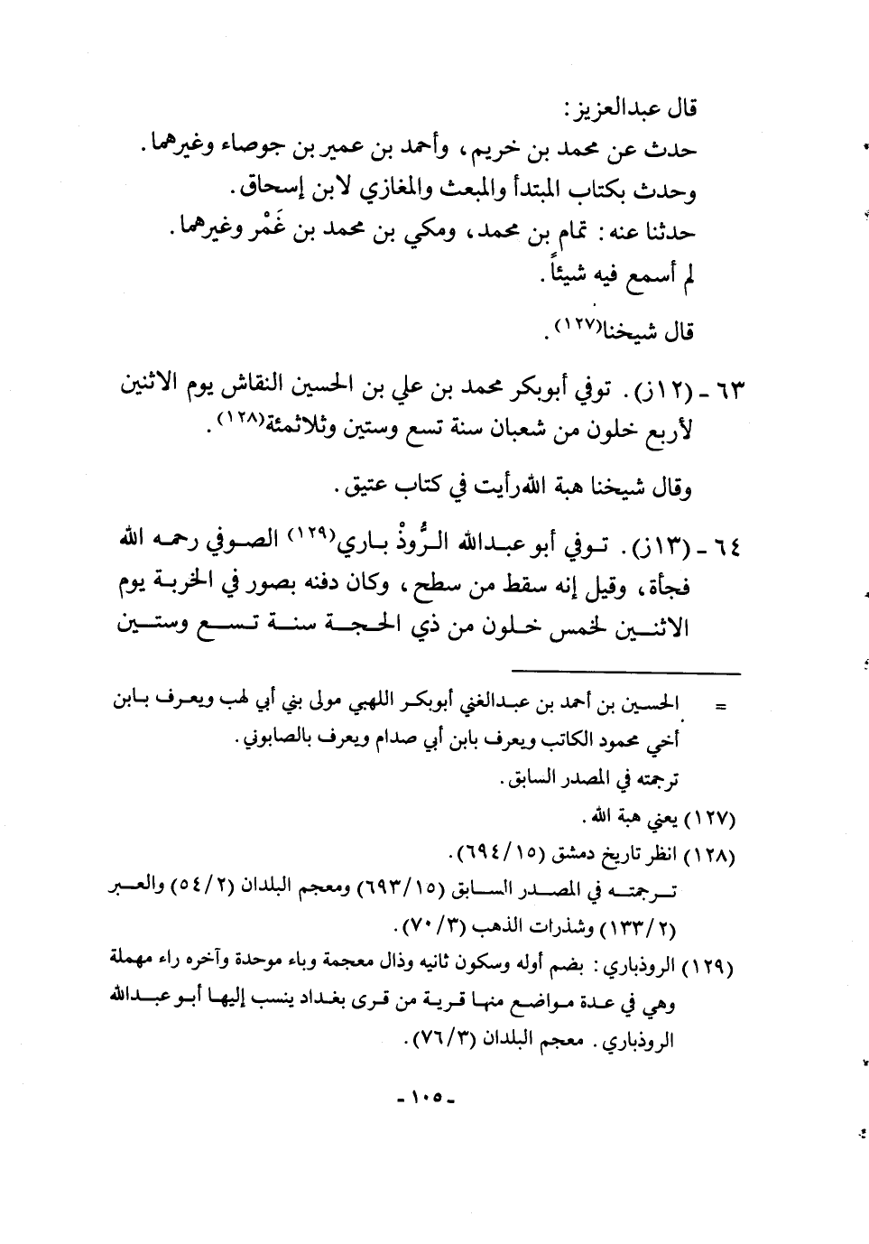 63 - (12 ز) توفّي أَبُو بكر مُحَمَّد بن عَليّ بن الْحُسَيْن النقاش يَوْم الْإِثْنَيْنِ لأَرْبَع خلون من شعْبَان سنة تسع وَسِتِّينَ وثلاثمئة وَقَالَ شَيخنَا هبة الله رَأَيْت فِي كتاب عَتيق