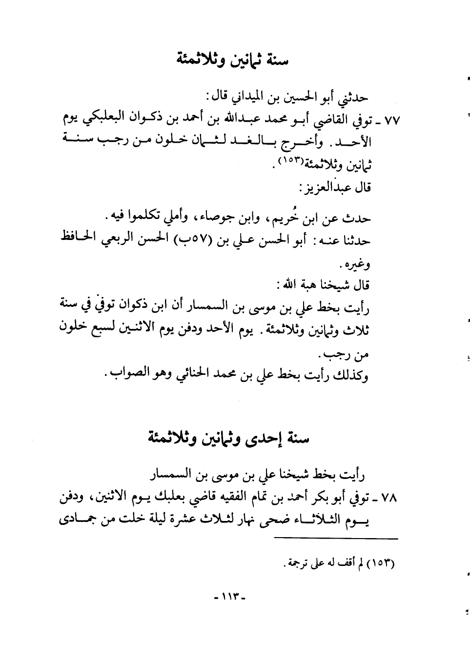 78 - توفّي أَبُو بكر أَحْمد بن تَمام الْفَقِيه قَاضِي بعلبك يَوْم الْإِثْنَيْنِ وَدفن يَوْم الثُّلَاثَاء ضحى نَهَار لثلاث عشرَة لَيْلَة خلت من جُمَادَى الأولى سنة إِحْدَى وَثَمَانِينَ وثلاثمئة وَدفن فِي بَاب الفراديس بعد عِلّة طَوِيلَة