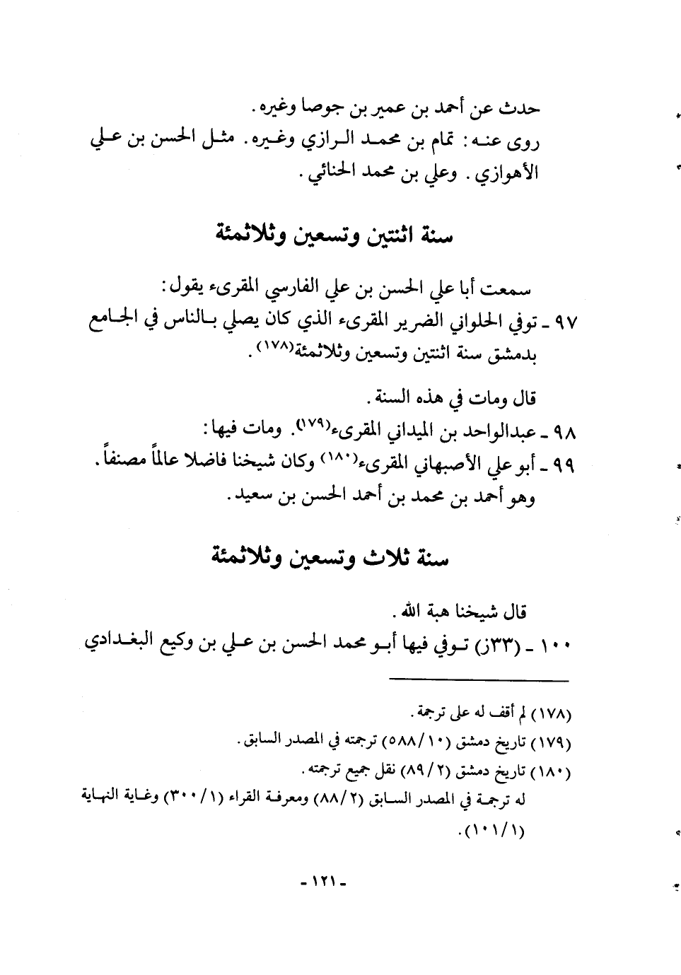 100 - (33 ز) توفّي فِيهَا أَبُو مُحَمَّد الْحسن بن عَليّ بن وَكِيع الْبَغْدَادِيّ الشَّاعِر بتنيس يَوْم الثُّلَاثَاء لسبع بَقينَ من جُمَادَى الأولى