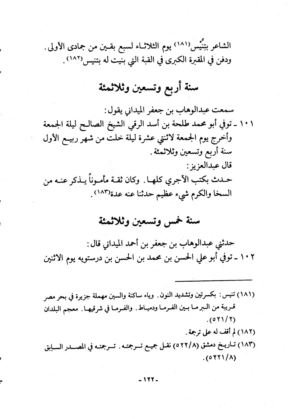 101 - توفّي أَبُو مُحَمَّد طَلْحَة بن أَسد الرقي الشَّيْخ الصَّالح لَيْلَة الْجُمُعَة وَأخرج يَوْم الْجُمُعَة لِاثْنَتَيْ عشرَة لَيْلَة خلت من شهر ربيع الأول سنة أَربع وَتِسْعين وثلاثمئة