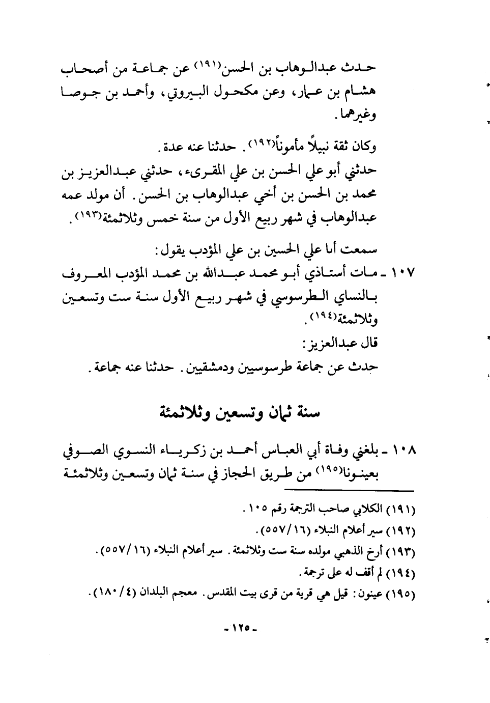 108 - بَلغنِي وَفَاة أبي الْعَبَّاس أَحْمد بن زَكَرِيَّاء النسوي الصُّوفِي بعينونا من طَرِيق الْحجاز فِي سنة ثَمَان وَتِسْعين وثلاثمئة وَدفن هُنَاكَ