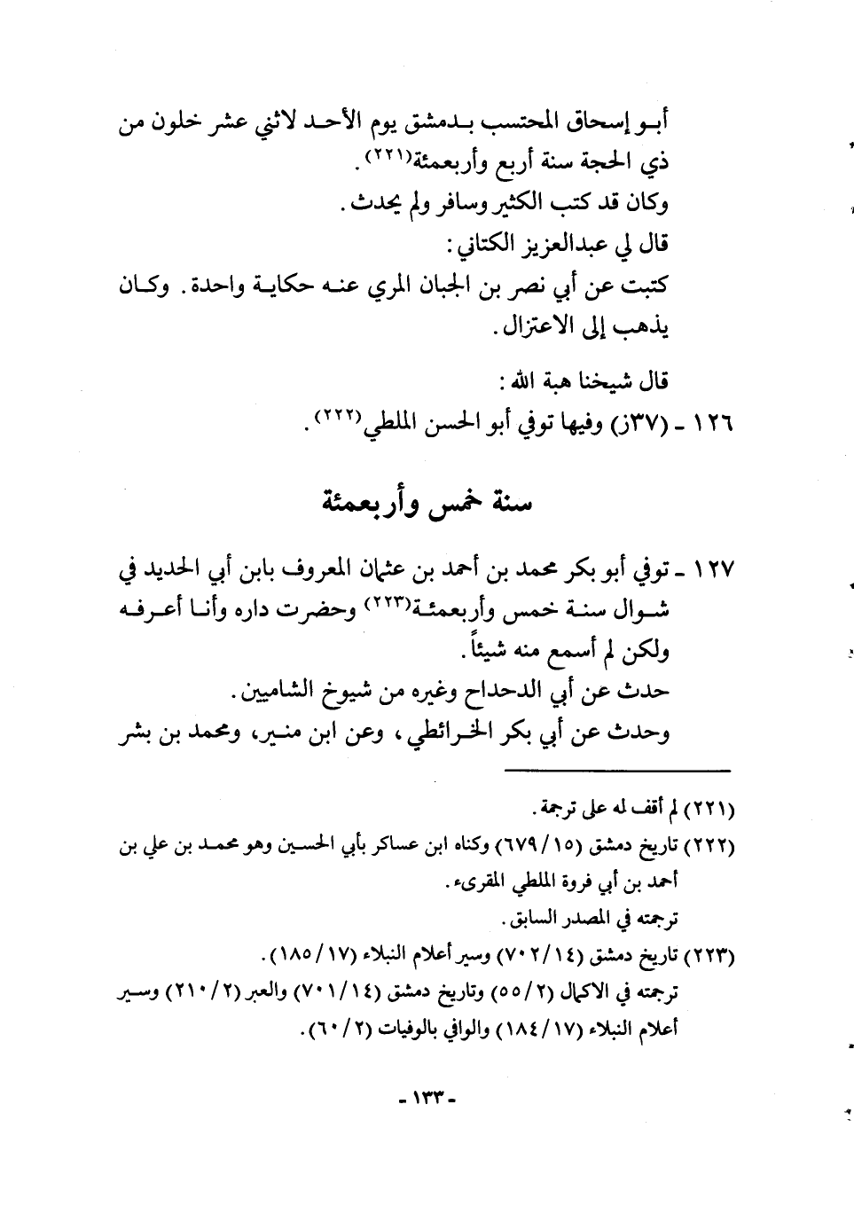 127 - توفّي أَبُو بكر مُحَمَّد بن أَحْمد بن عُثْمَان الْمَعْرُوف بِابْن أبي الْحَدِيد فِي شَوَّال سنة خمس وأربعمئة وَحَضَرت دَاره وَأَنا أعرفهُ وَلَكِن لم أسمع مِنْهُ شَيْئا