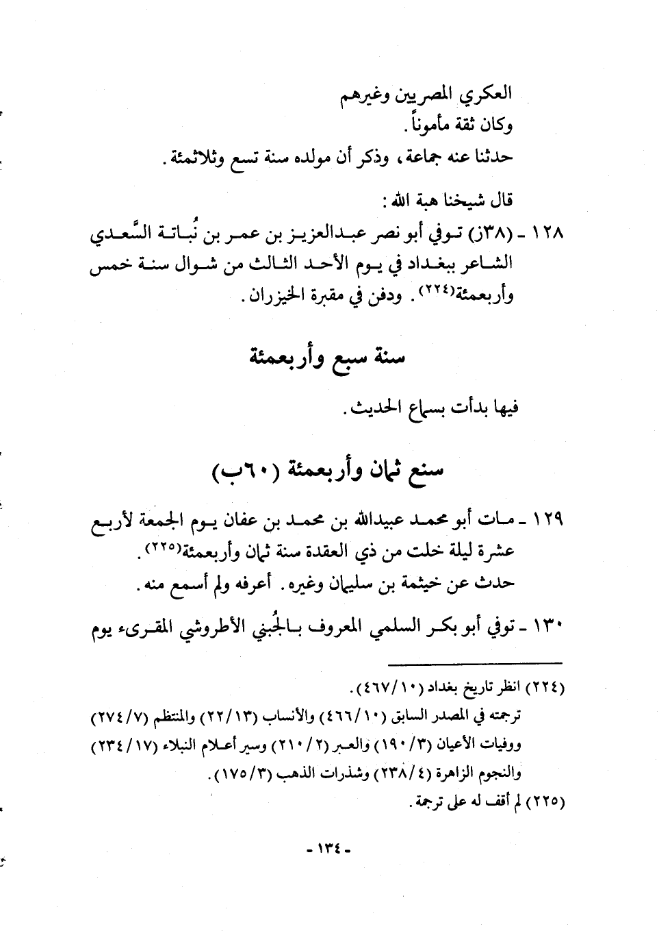 128 - (38 ز) توفّي أَبُو نصر عبد الْعَزِيز بن عمر بن نباتة السَّعْدِيّ الشَّاعِر بِبَغْدَاد فِي يَوْم الْأَحَد الثَّالِث من شَوَّال سنة خمس وأربعمئة وَدفن فِي مَقْبرَة الخيزران