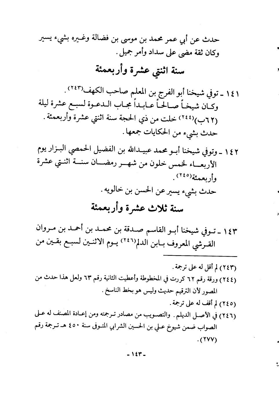 143 - توفّي شَيخنَا أَبُو الْقَاسِم صَدَقَة بن مُحَمَّد بن أَحْمد بن مَرْوَان الْقرشِي الْمَعْرُوف بِابْن الدلم يَوْم الْإِثْنَيْنِ لسبع بَقينَ من