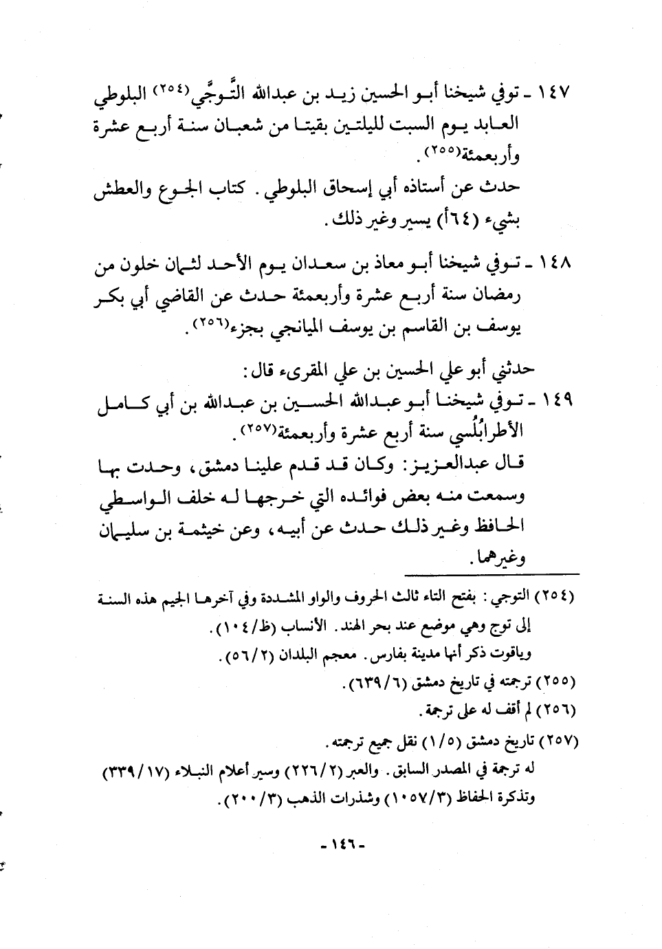 147 - توفّي شَيخنَا أَبُو الْحُسَيْن زيد بن عبد الله التوجي البلوطي العابد يَوْم السبت لليلتين بَقِيَتَا من شعْبَان سنة أَربع عشر وأربعمئة