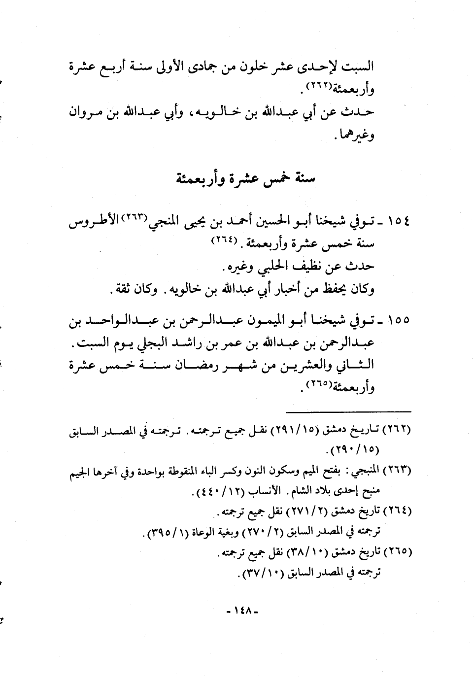 154 - توفّي شَيخنَا أَبُو الْحُسَيْن أَحْمد بن يحيي المنجي الأطروس سنة خمس عشرَة وأربعمئة