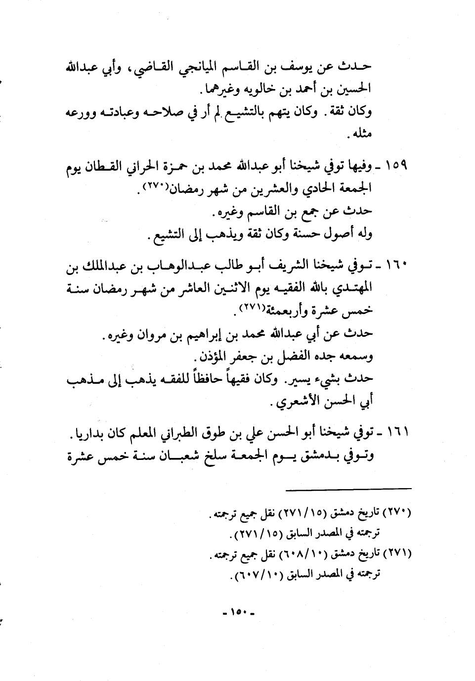 159 - وفيهَا توفّي شَيخنَا أَبُو عبد الله مُحَمَّد بن حَمْزَة الْحَرَّانِي الْقطَّان يَوْم الْجُمُعَة الْحَادِي وَالْعِشْرين من شهر رَمَضَان