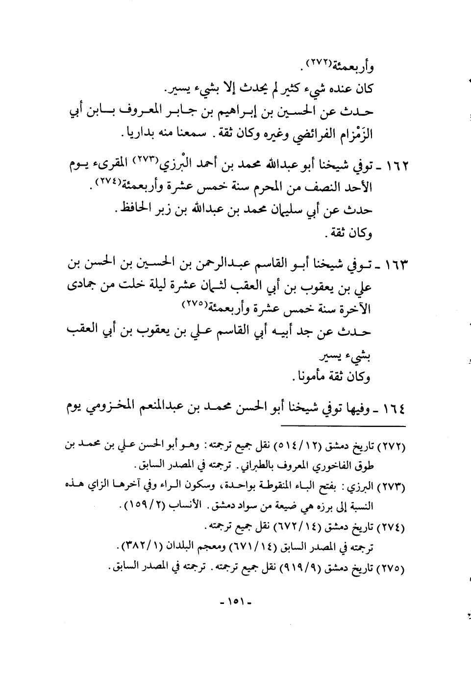 162 - توفّي شَيخنَا أَبُو عبد الله مُحَمَّد بن أَحْمد البرزي المقرىء يَوْم الْأَحَد النّصْف من الْمحرم سنة خمس عشرَة وأربعمئة