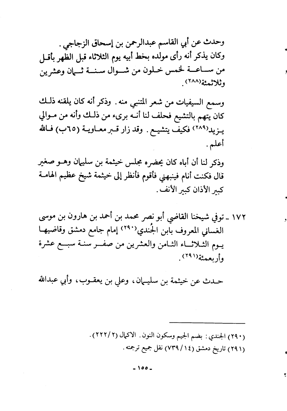 172 - توفّي شَيخنَا القَاضِي أَبُو نصر مُحَمَّد بن أَحْمد بن هَارُون بن مُوسَى الغساني الْمَعْرُوف بِابْن الجندي إِمَام جَامع دمشق وقاضيها يَوْم الثُّلَاثَاء الثَّامِن وَالْعِشْرين من صفر سنة سبع عشرَة وأربعمئة