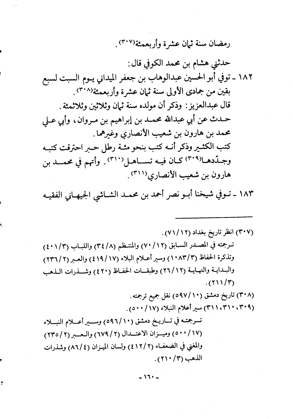 183 - توفّي شَيخنَا أَبُو نصر أَحْمد بن مُحَمَّد الشَّاشِي الجيهاني الْفَقِيه الفرضي فِي شَوَّال سنة ثَمَان عشرَة وَكَانَ درس الْفِقْه على أبي حَامِد والفرائض على جمَاعَة أحدهم ابْن اللبان