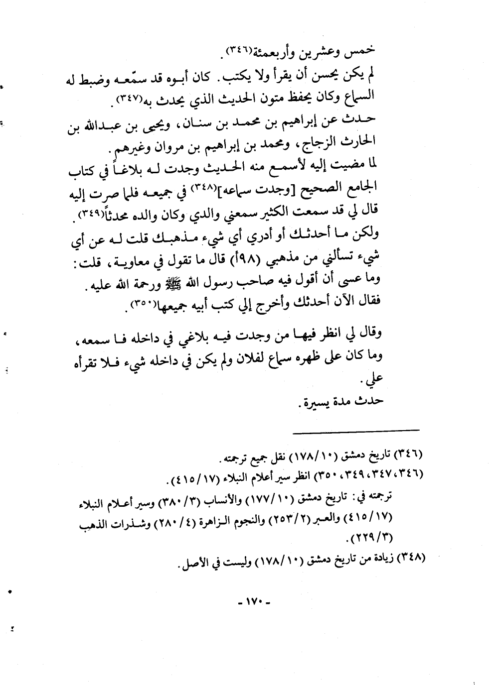 وَلَكِن مَا أحَدثك أَو أَدْرِي أَي شَيْء مذهبك قلت لَهُ عَن أَي شَيْء تَسْأَلنِي من مذهبي (98 أ) قَالَ مَا تَقول فِي مُعَاوِيَة قلت وَمَا عَسى أَن أَقُول فِيهِ صَاحب رَسُول الله صلى الله عَلَيْهِ وَسلم وَرَحْمَة الله عَلَيْهِ