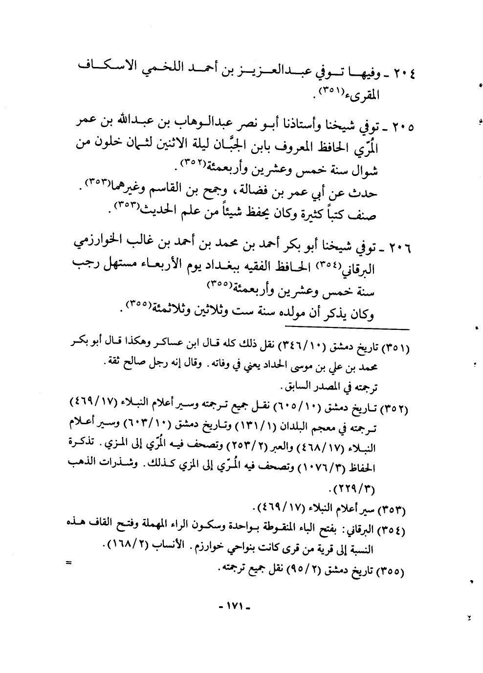 206 - توفّي شَيخنَا أَبُو بكر أَحْمد بن مُحَمَّد بن أَحْمد بن غَالب الْخَوَارِزْمِيّ البرقاني الْحَافِظ الْفَقِيه بِبَغْدَاد يَوْم الْأَرْبَعَاء مستهل رَجَب سنة خمس وَعشْرين وأربعمئة