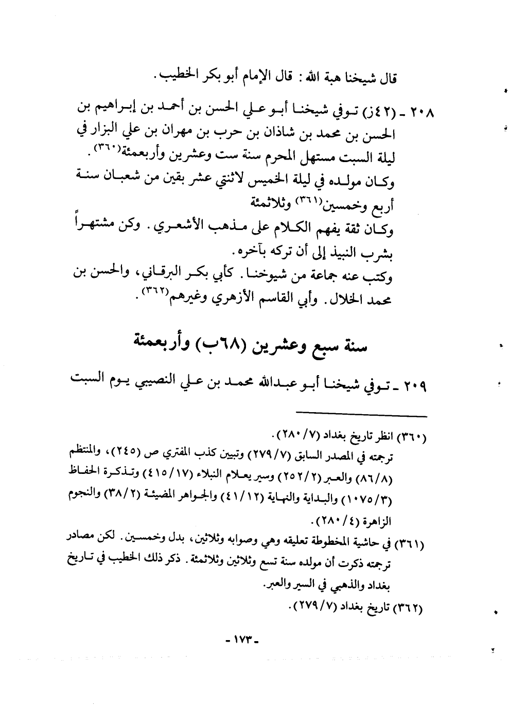 208 - (24 ز) توفّي شَيخنَا أَبُو عَليّ الْحسن بن أَحْمد بن إِبْرَاهِيم بن الْحسن بن مُحَمَّد بن شَاذان بن حَرْب بن مهْرَان بن عَليّ الْبَزَّار فِي لَيْلَة السبت مستهل الْمحرم سنة سِتّ وَعشْرين وأربعمئة