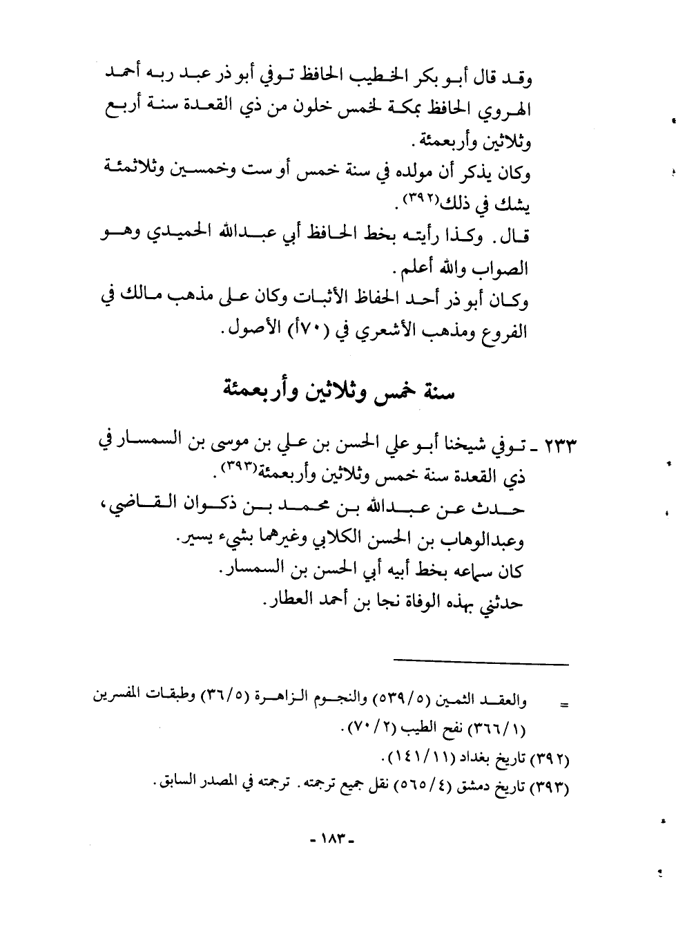 233 - توفّي شَيخنَا أَبُو عَليّ الْحسن بن عَليّ بن مُوسَى بن السمسار فِي ذِي الْقعدَة سنة خمس وَثَلَاثِينَ وأربعمئة