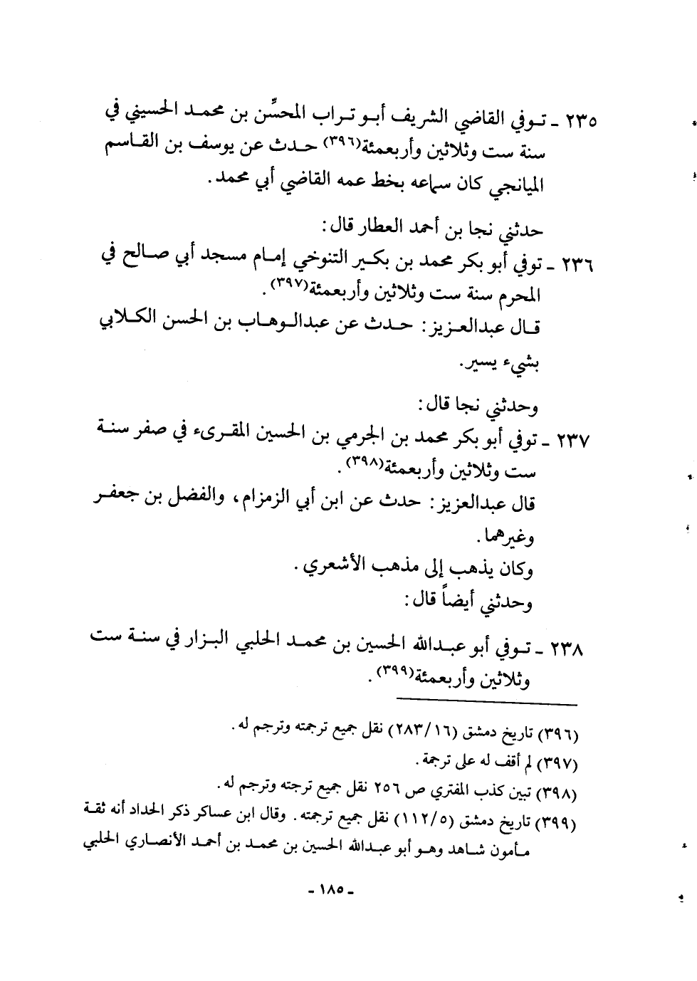 238 - توفّي أَبُو عبد الله الْحُسَيْن بن مُحَمَّد الْحلَبِي الْبَزَّار فِي سنة سِتّ وَثَلَاثِينَ وأربعمئة