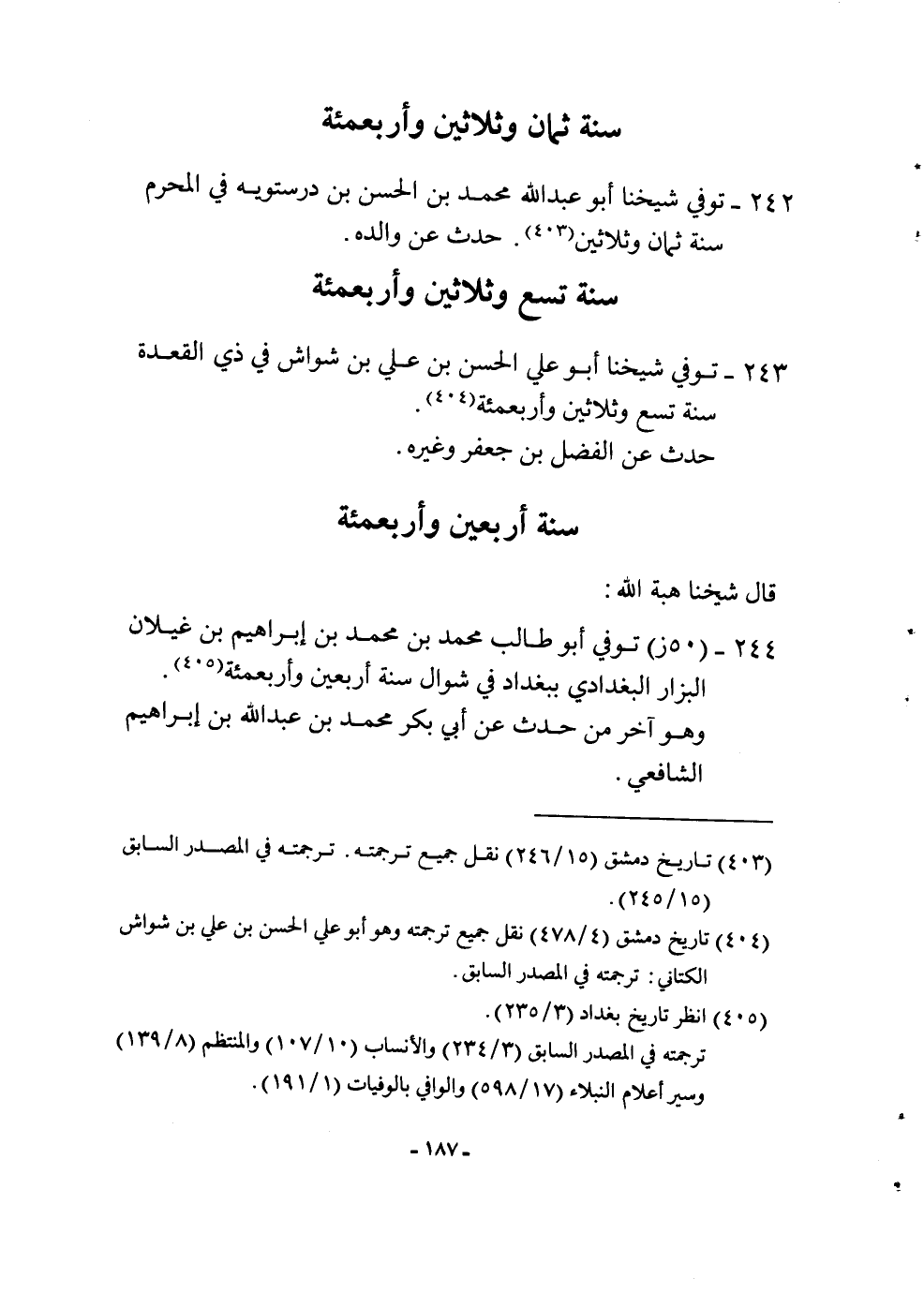 242 - توفّي شَيخنَا أَبُو عبد الله مُحَمَّد بن الْحسن بن درسْتوَيْه فِي الْمحرم سنة ثَمَان وَثَلَاثِينَ حدث عَن وَالِده