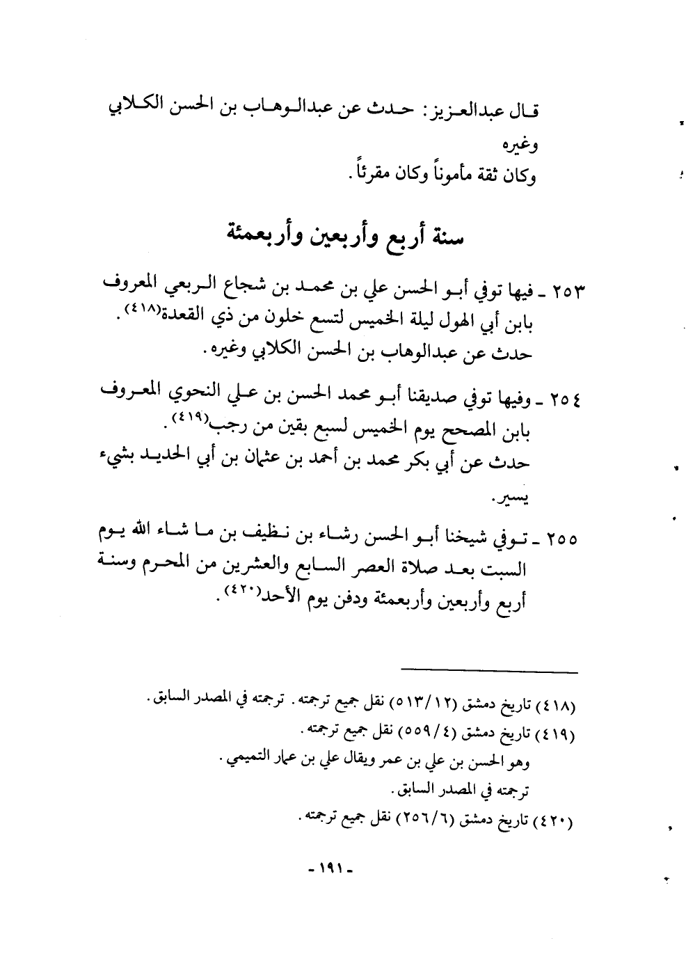 255 - توفّي شَيخنَا أَبُو الْحسن رشاء بن نظيف بن مَا شَاءَ الله يَوْم السبت بعد صَلَاة الْعَصْر السَّابِع وَالْعِشْرين من الْمحرم وَسنة أَربع وَأَرْبَعين وأربعمئة وَدفن يَوْم الْأَحَد