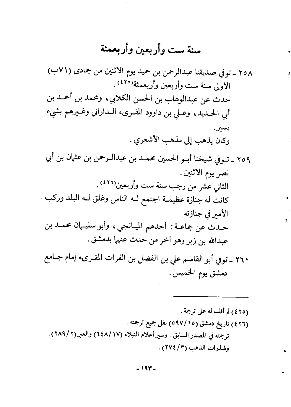 258 - توفّي صديقنا عبد الرحمن بن حميد يَوْم الْإِثْنَيْنِ من جُمَادَى (71 ب) الأولى سنة سِتّ وَأَرْبَعين وأربعمئة