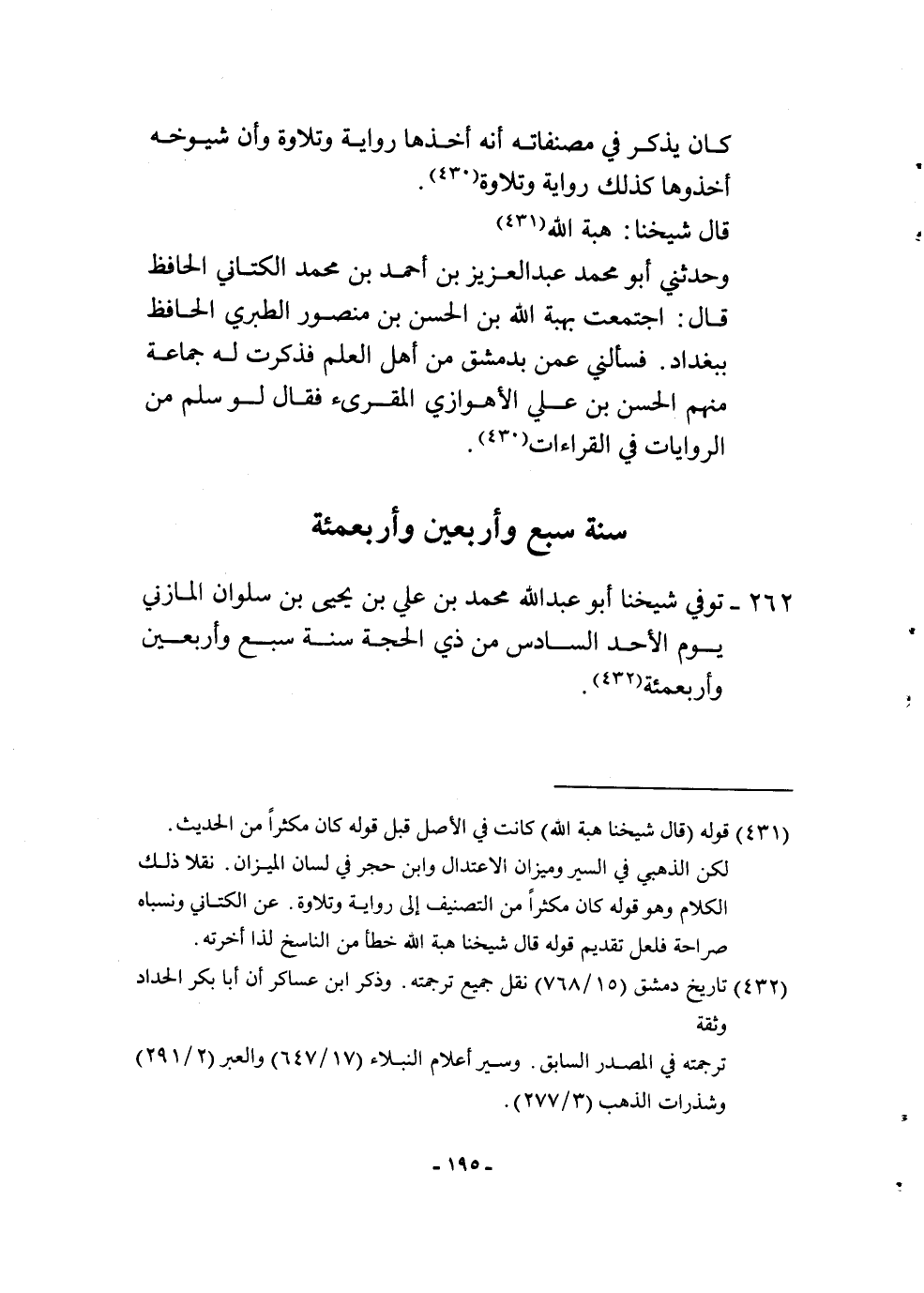 وحَدثني أَبُو مُحَمَّد عبد الْعَزِيز بن أَحْمد بن مُحَمَّد الكتاني الْحَافِظ قَالَ اجْتمعت بِهِبَة الله الْحسن بن مَنْصُور الطَّبَرِيّ الْحَافِظ بِبَغْدَاد فَسَأَلَنِي عَمَّن بِدِمَشْق من أهل الْعلم فَذكرت لَهُ جمَاعَة مِنْهُم الْحسن بن عَليّ الْأَهْوَازِي المقرىء فَقَالَ لَو سلم من الرِّوَايَات فِي الْقرَاءَات