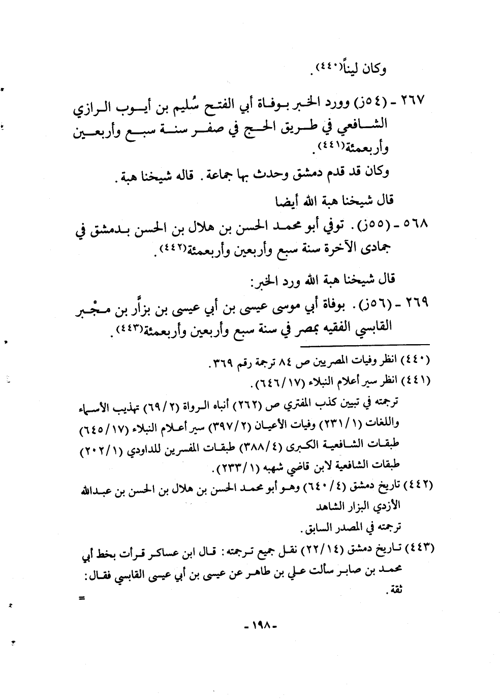 267 - (54 ز) وَورد الْخَبَر بوفاة أبي الْفَتْح سليم بن أَيُّوب الرَّازِيّ الشَّافِعِي فِي طَرِيق الْحَج فِي صفر سنة سبع وَأَرْبَعين وأربعمئة