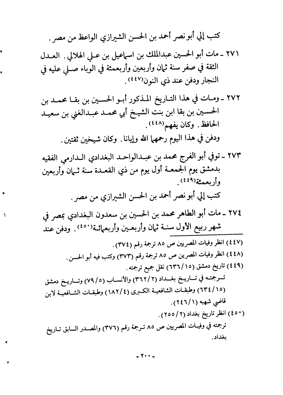 274 - مَاتَ أَبُو الطَّاهِر مُحَمَّد بن الْحُسَيْن بن سعدون الْبَغْدَادِيّ بِمصْر فِي شهر ربيع الأول سنة ثَمَان وَأَرْبَعين وَأَرْبَعمِائَة وَدفن عِنْد مَسْجِد الْأَقْدَام
