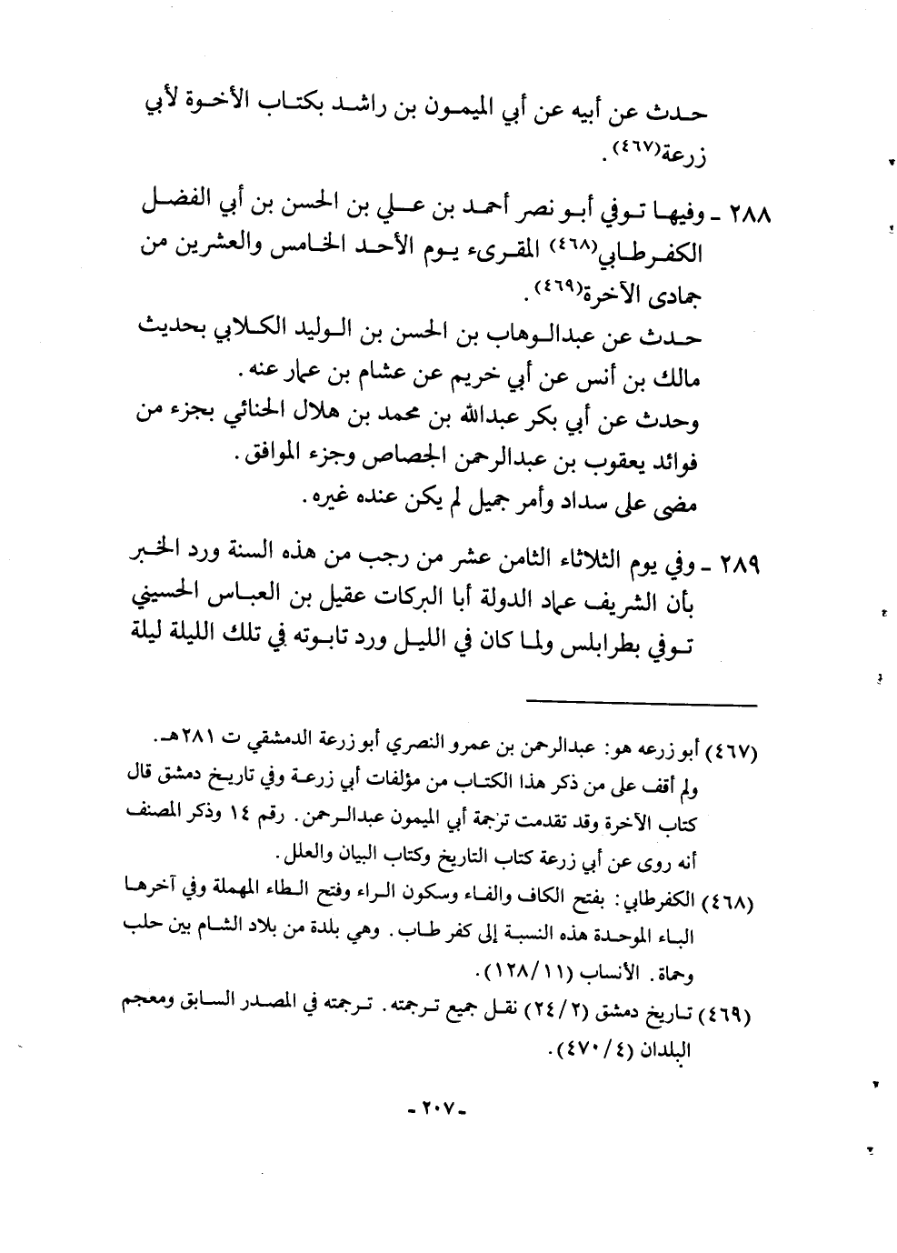 289 - وَفِي يَوْم الثُّلَاثَاء الثَّامِن عشر من رَجَب من هَذِه السّنة ورد الْخَبَر بِأَن الشريف عماد الدولة أَبَا البركات عقيل بن الْعَبَّاس الْحُسَيْنِي توفّي بطرابلس وَلما كَانَ فِي اللَّيْل ورد تابوته فِي تِلْكَ اللَّيْلَة لَيْلَة
