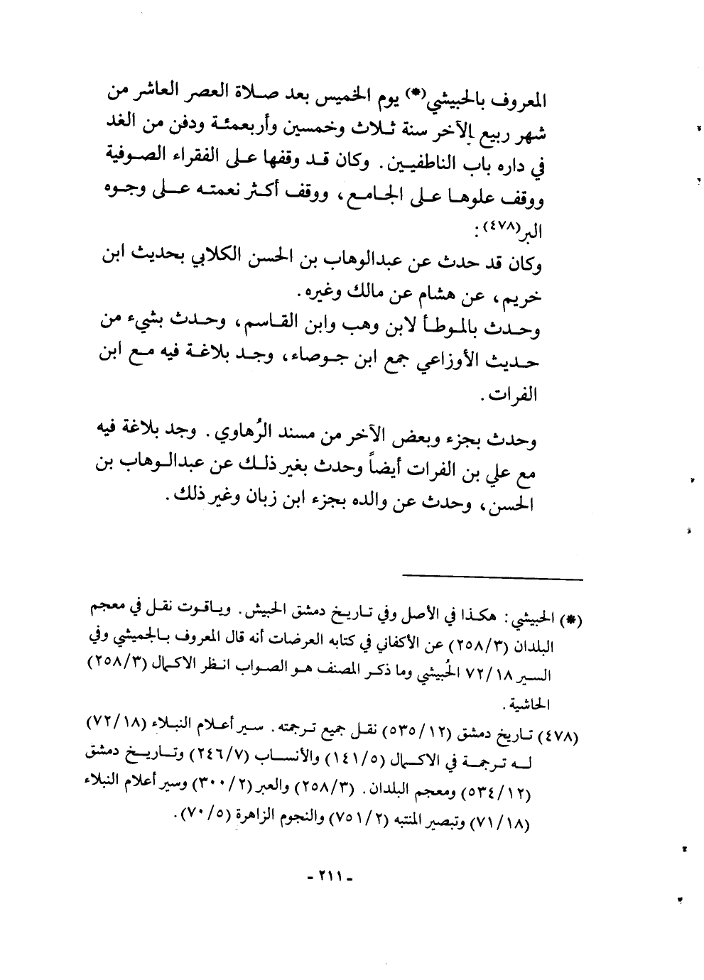الْمَعْرُوف بالحبيشي يَوْم الْخَمِيس بعد صَلَاة الْعَصْر الْعَاشِر من شهر ربيع الآخر سنة ثَلَاث وَخمسين وأربعمئة وَدفن من الْغَد فِي دَاره بَاب الناطفيين وَكَانَ قد وَقفهَا على الْفُقَرَاء الصُّوفِيَّة ووقف علوها على الْجَامِع ووقف أَكثر نعْمَته على وُجُوه الْبر