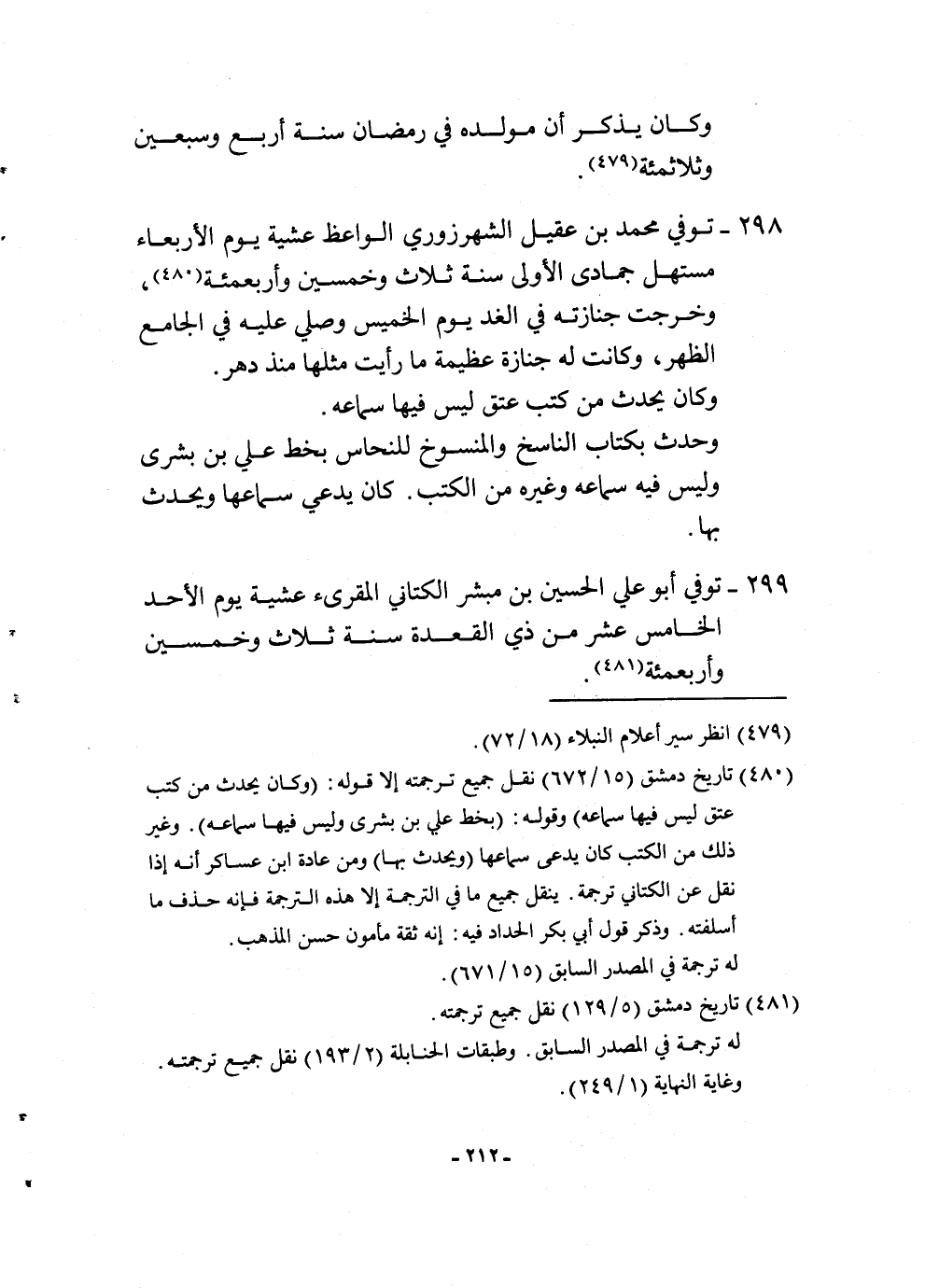 298 - توفّي مُحَمَّد بن عقيل الشهرزوري الْوَاعِظ عَشِيَّة يَوْم الْأَرْبَعَاء مستهل جُمَادَى الأولى سنة ثَلَاث وَخمسين وأربعمئة وَخرجت جنَازَته فِي الْغَد يَوْم الْخَمِيس وَصلي عَلَيْهِ فِي الْجَامِع الظّهْر وَكَانَت لَهُ جَنَازَة عَظِيمَة مَا رَأَيْت مثلهَا مُنْذُ دهر