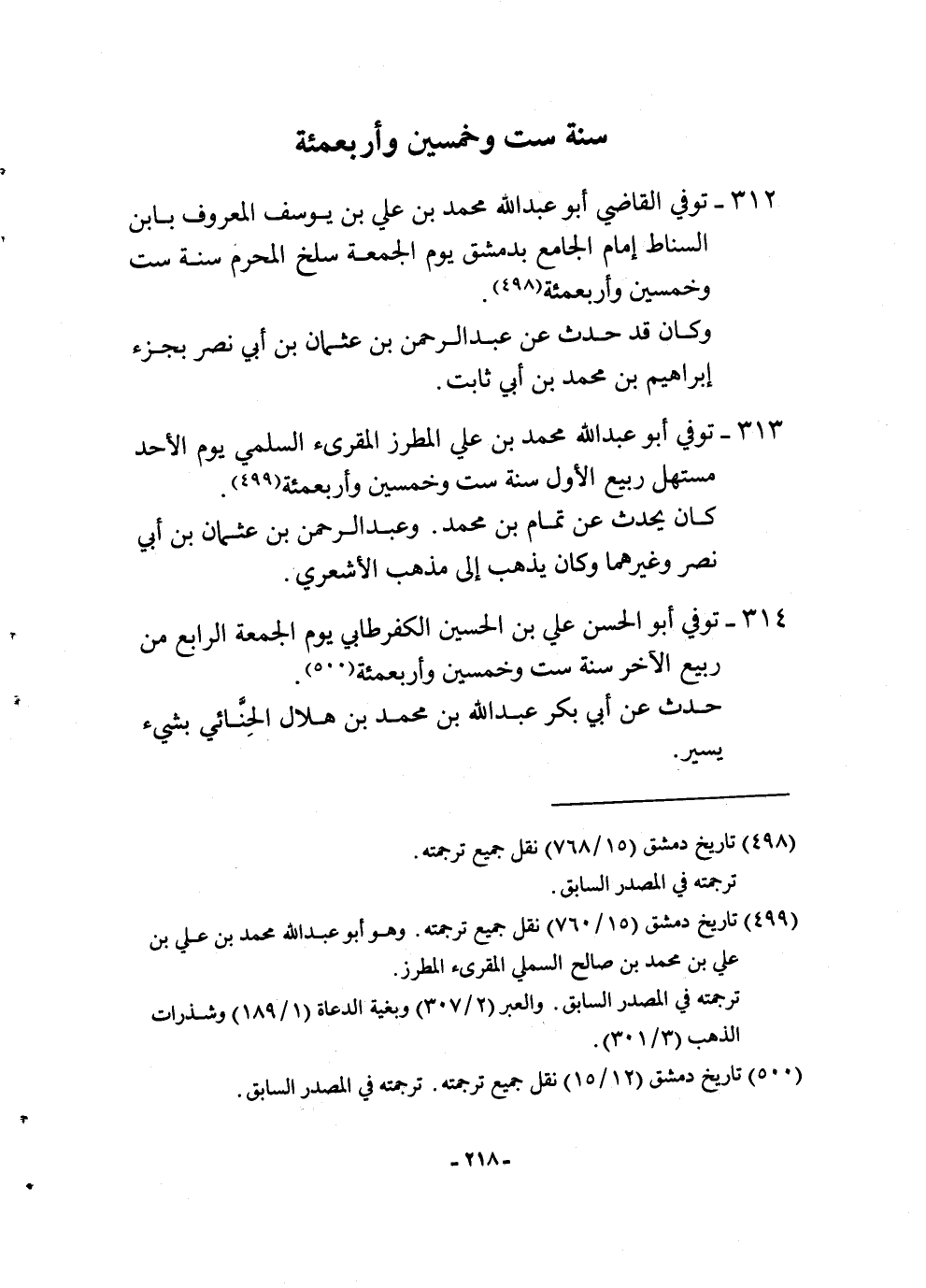 312 - توفّي القَاضِي أَبُو عبد الله مُحَمَّد بن عَليّ بن يُوسُف الْمَعْرُوف بِابْن السناط إِمَام الْجَامِع بِدِمَشْق يَوْم الْجُمُعَة سلخ الْمحرم سنة سِتّ وَخمسين واربعمئة