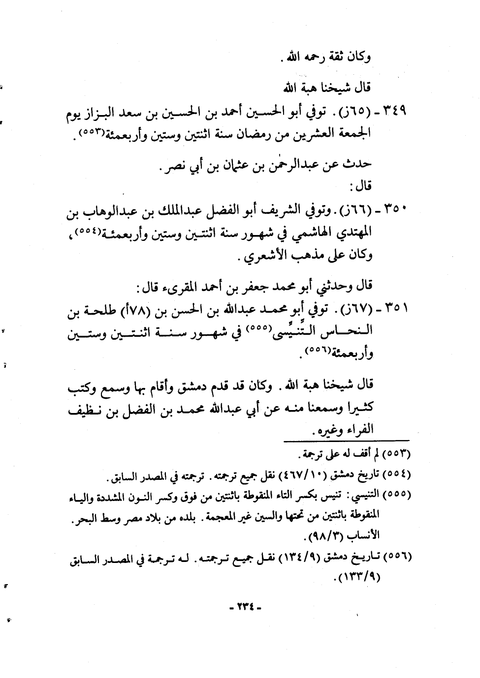 35 - (67 ز) توفّي أَبُو مُحَمَّد عبد الله بن الْحسن بن (78 أ) طَلْحَة بن النّحاس التنيسى فِي شهور سنة ثِنْتَيْنِ وَسِتِّينَ وأربعمئة