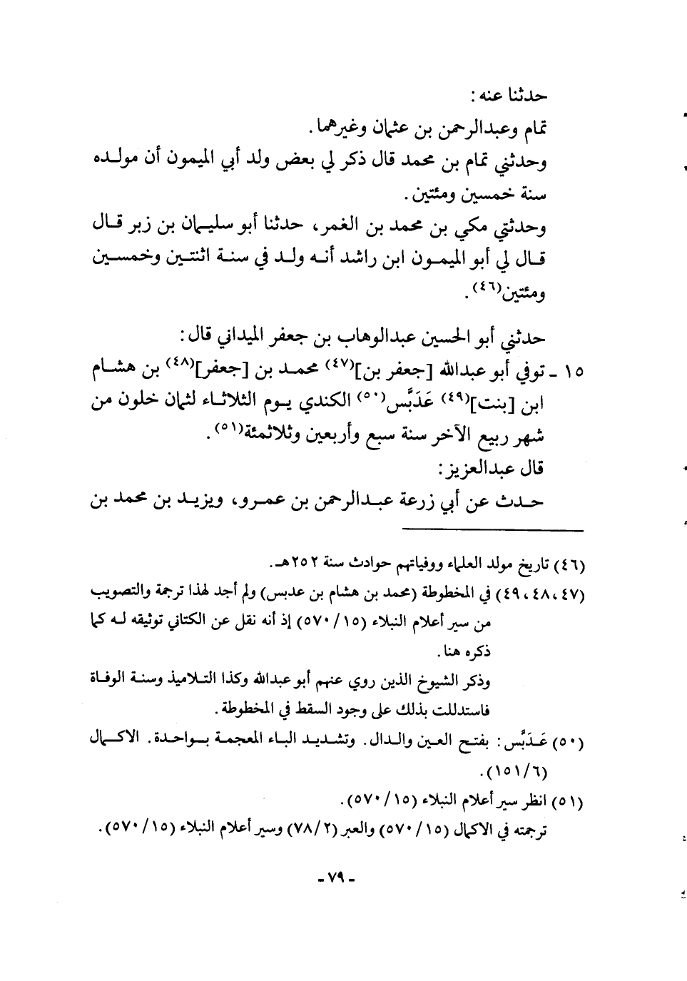 15 - توفّي أَبُو عبد الله] جَعْفَر بن [مُحَمَّد بن] جَعْفَر [بن هِشَام ابْن] بنت [عدبس الْكِنْدِيّ يَوْم الثُّلَاثَاء لثمان خلون من شهر ربيع الآخر سنة سبع وَأَرْبَعين وثلاثمئة